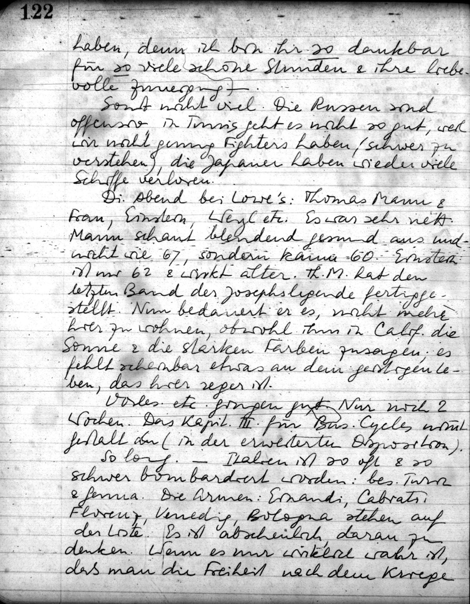 Di. Abend bei Lowe's: Thomas Mann & Frau, Einstein, Weyl etc. Es war sehr nett. Mann schaut blendend gesund aus und nicht wie 67, sondern kaum 60. Einstein ist nur 62 & wirkt älter. Th. M. hat den letzten Band der Josephslegende fertiggestellt. Nun bedauert er es, nicht mehr hier zu wohnen, obwohl ihm in Calif. die Sonne & die starken Farben zusagen; es fehlt scheinbar etwas an dem geistigen Leben, das hier reger ist.