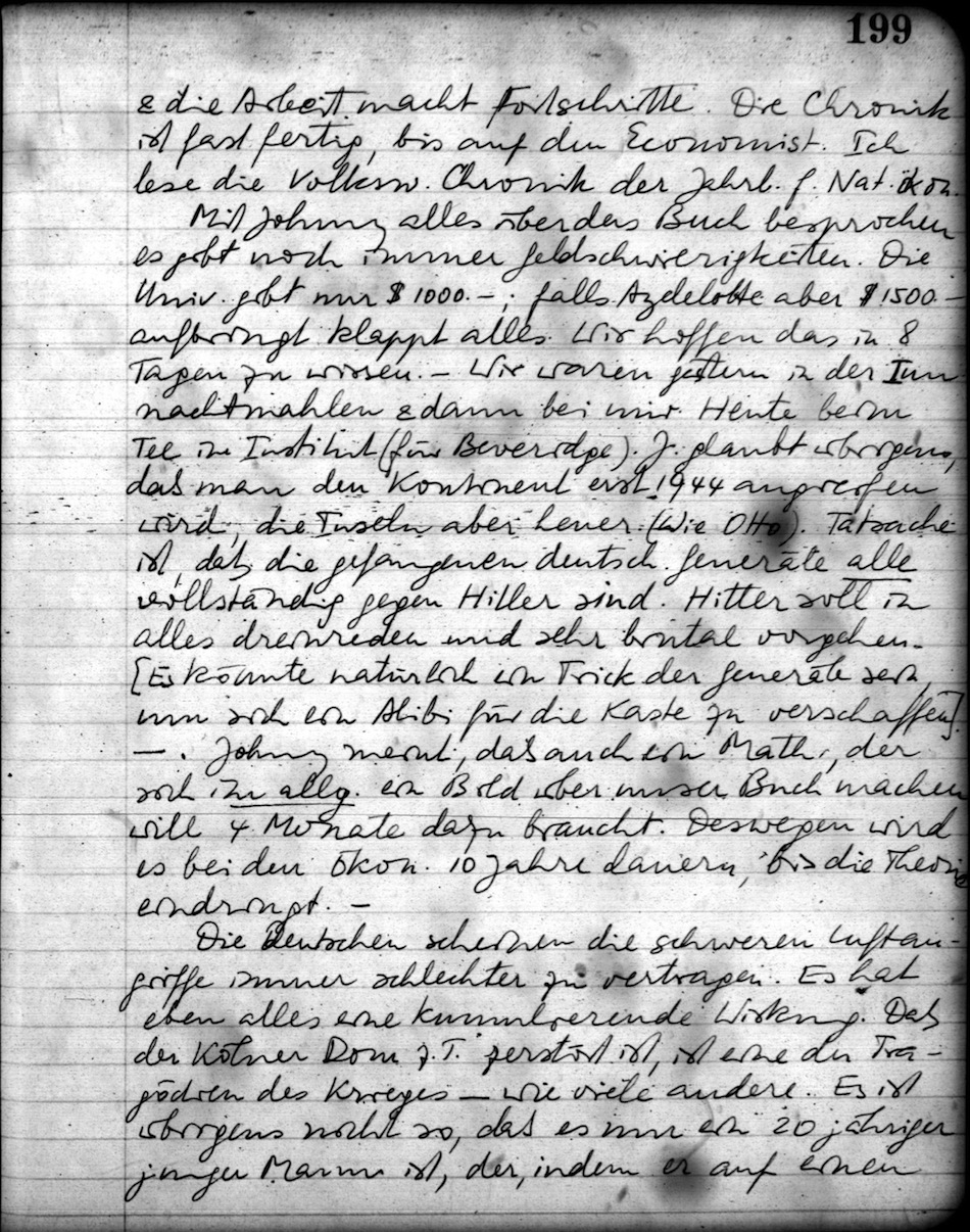 Mit Johnny alles über das Buch besprochen, es gibt noch immer Geldschwierigkeiten. Die Univ. gibt nur $ 1.000,-; falls Aydelotte aber $ 1.500,- aufbringt, klappt alles. Wir hoffen das in 8 Tagen zu willen. Wir waren gestern in der Inn nachtmahlen & dann bei mir. Heute beim Tel. im Institut (für Beveridge). J. glaubt übrigens, daß man den Kontinent erst 1944 angreifen wird, die Inseln aber heuer (wie Otto). Tatsache ist, daß die gefangenen deutsch. Generäle alle vollständig gegen Hitler sind. Hitler soll in alles dreinreden und sehr brutal vorgehen. [Es könnte natürlich ein Trick der Generäle sein, um sich ein Alibi für die Kaste zu verschaffen.] Johnny meint, daß auch ein Math., der sich im allg. ein Bild über unser Buch machen will, 4 Monate dazu braucht. Deswegen wird es bei den Ökon. 10 Jahre dauern, bis die Theorie eindringt.