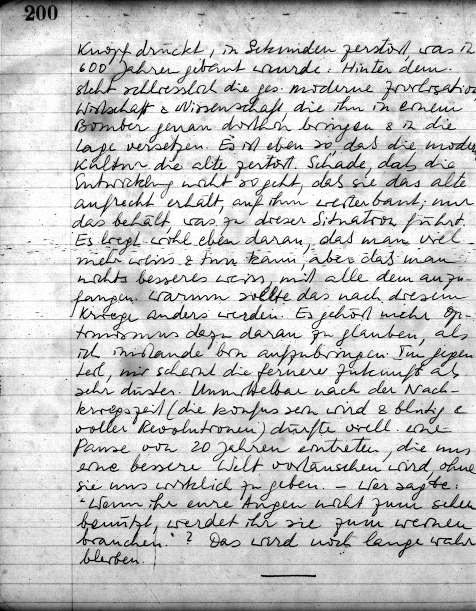 Die Deutschen scheinen die schweren Luftangriffe immer schlechter zu vertragen. Es hat eben alles eine kumulierende Wirkung. Daß der Kölner Dom z.T. zerstört ist, ist eine der Tragödien des Krieges wie viele andere. Es ist übrigens nicht so, daß es nur ein 20jähriger junger Mann ist, der, indem er auf einen Knopf drückt, in Sekunden zerstört, was in 600 Jahren gebaut wurde: Hinter dem steht schliesslich die ges. moderne Zivilisation, Wirtschaft & Wissenschaft, die ihn in einem Bomber genau dorthin bringen & in die Lage versetzen. Es ist eben so, daß die moderne Kultur die alte zerstört. Schade, daß die Entwicklung nicht so geht, daß sie das alte aufrecht erhält, auf ihm weiterbaut; nun das behält, was zu dieser Situation führt. Es liegt wohl eben daran, daß man viel mehr weiss & tun kann, aber daß man nichts besseres weiss, mit alledem anzufangen. Warum sollte das nach diesem Kriege anders werden. Es gehört mehr Optimismus dazu, daran zu glauben, als ich imstande bin aufzubringen. Im Gegenteil, mir scheint die fernere Zukunft als sehr düster. Unmittelbar nach der Nachkriegszeit (die konfus sein wird & blutig & voller Revolutionen) dürfte viell. eine Pause von 20 Jahren eintreten, die uns eine bessere Welt vortäuschen wird, ohne sie uns wirklich zu geben. Wer sagte: "Wenn ihr eure Augen nicht zum sehen benützt, werdet ihr sie zum weinen brauchen."? Das wird wohl lange wahr bleiben.