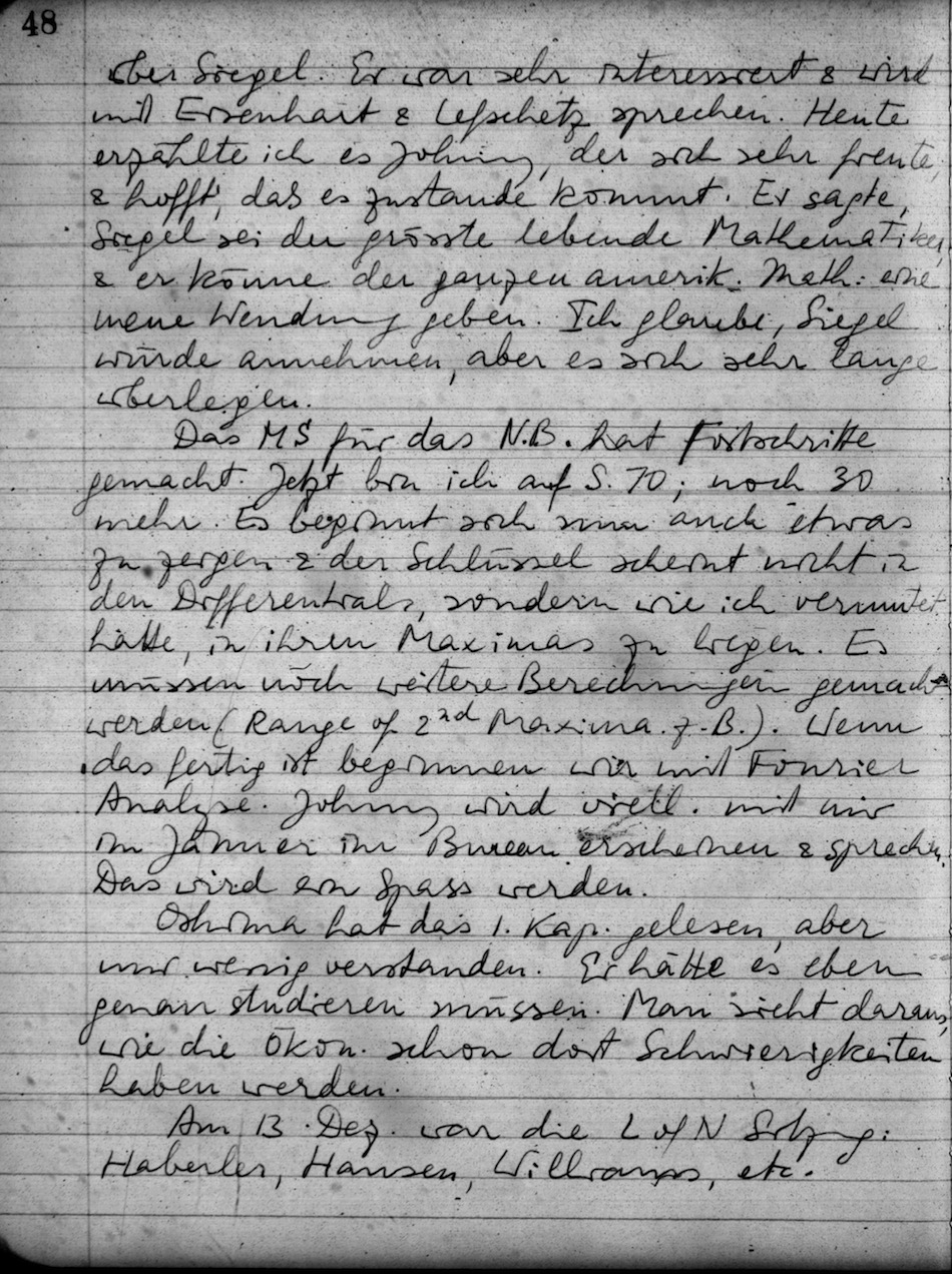 Am 31. Dez. sprach ich mit Dodds über Siegel. Er war sehr interessiert & wird mit Eisenhart & Lefschetz sprechen. Heute erzählte ich es Johnny, der sich sehr freute & hofft, daß es zustande kommt. Er sagte, Siegel sei der grösste lebende Mathematiker & er könne der ganzen amerik. Math. eine neue Wendung geben. Ich glaube, Siegel würde annehmen, aber es sich sehr lange überlegen.