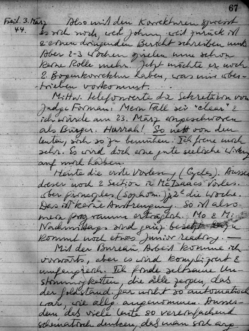 Mittw. Telefonierte die Sekretärin von Judge Forman: Mein Fall sei "clear" & ich würde am 23. März eingeschworen als Bürger. Hurrah! So nett von den Leuten, sich so zu bemühen: Ich freue mich sehr. Es wird doch eine gute seelische Wirkung auf mich haben.