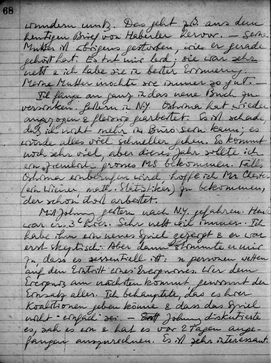 Ich fange an ganz in das neue Buch zu versinken. Gestern in N.Y. Oshima hat wieder angezogen & fleissig gearbeitet. Es ist schade, daß ich nicht mehr im Büro sein kann; es würde alles viel schneller gehen. Es kommt noch sehr viel, aber dieses Jahr sollte ich ein ziemlich grosses MS bekommen. Falls Oshima einberufen wird, hoffe ich Mr. Chester (ein Wiener, math. Statistiker) zu bekommen, der schon dort arbeitet.