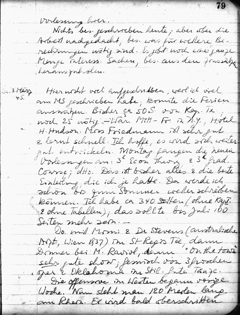 Hier nicht viel aufgeschrieben, weil ich viel am MS geschrieben habe; konnte die Ferien ausnutzen. Bisher ca. 50 S. von Kap. IX; noch 25 nötig. War Mitt. Fr. in N.Y., Hotel H. Hudson. Miss Friedmann ist sehr gut & lernt schnell. Ich hoffe, es wird sich weiter gut entwickeln. Montag fangen die neuen Vorlesungen an: 3h Econ. Theory, & 3h Grad. Course; dtto. Das ist bisher alles & die beste Einteilung, die ich je hatte. Da werde ich schön bis zum Sommer weiter schreiben können. Ich habe ca 340 Seiten (ohne Kap I. & ohne Tabellen); das sollte bis Juli 100 Seiten mehr sein.