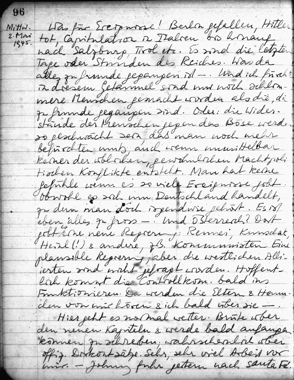 Was für Ereignisse! Berlin gefallen, Hitler tot, Capitulation in Italien bis hinauf nach Salzburg, Tirol etc. Es sind die letzten Tage oder Stunden des Reiches. Was da alles zu Grunde gegangen ist . Und ich fürchte, in diesem Getaumel sind nur noch schlimmere Menschen gemacht worden als die, die zu Grunde gegangen sind. Oder: die Widerstände der Menschen gegen das Böse werden so geschwächt sein, daß man noch mehr befürchten muß, auch wenn unmittelbar keiner der üblichen, gewöhnlichen Machtpolitischen Konflikte entsteht. Man hat keine Gefühle, wenn es so viele Ereignisse gibt. Obwohl es sich um Deutschland handelt, zu dem man doch irgendwie gehört. Es ist eben alles zu gross. Und Österreich? Dort gibt es eine neue Regierung: Renner, Kunschak, Heinl (!) & andere, z.B. Kommunisten. Eine plausible Regierung, aber die westlichen Alliierten sind nicht gefragt worden. Hoffentlich kommt die Controllkom. bald ins Funktionieren. Da werden die Eltern & Hannchen von mir hören & ich bald über sie .