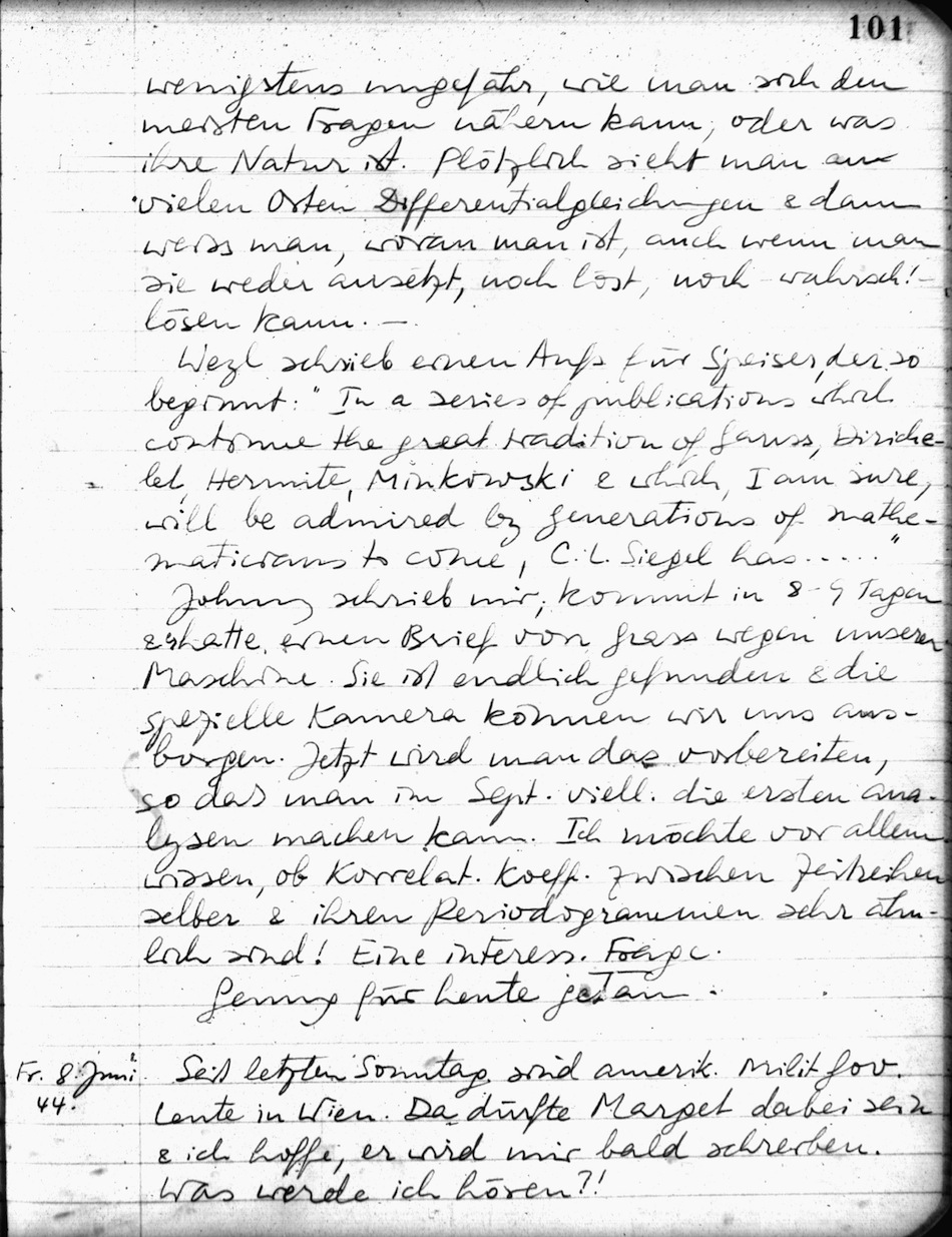 Mit Johnny viele Gespräche gehabt, bes. beim Frühstück. Gut wie je. Er freut sich, daß ich täglich Math. studiere; jetzt bei der Darstellung trig. Funktionen im komplexen. Enorme Vereinfachungen & höchst seltsame Zus.hänge; z.B. sin & .in etc. Da steckt noch viel mehr dahinter. Aber es wird mir auch die Fourier An. klarer.