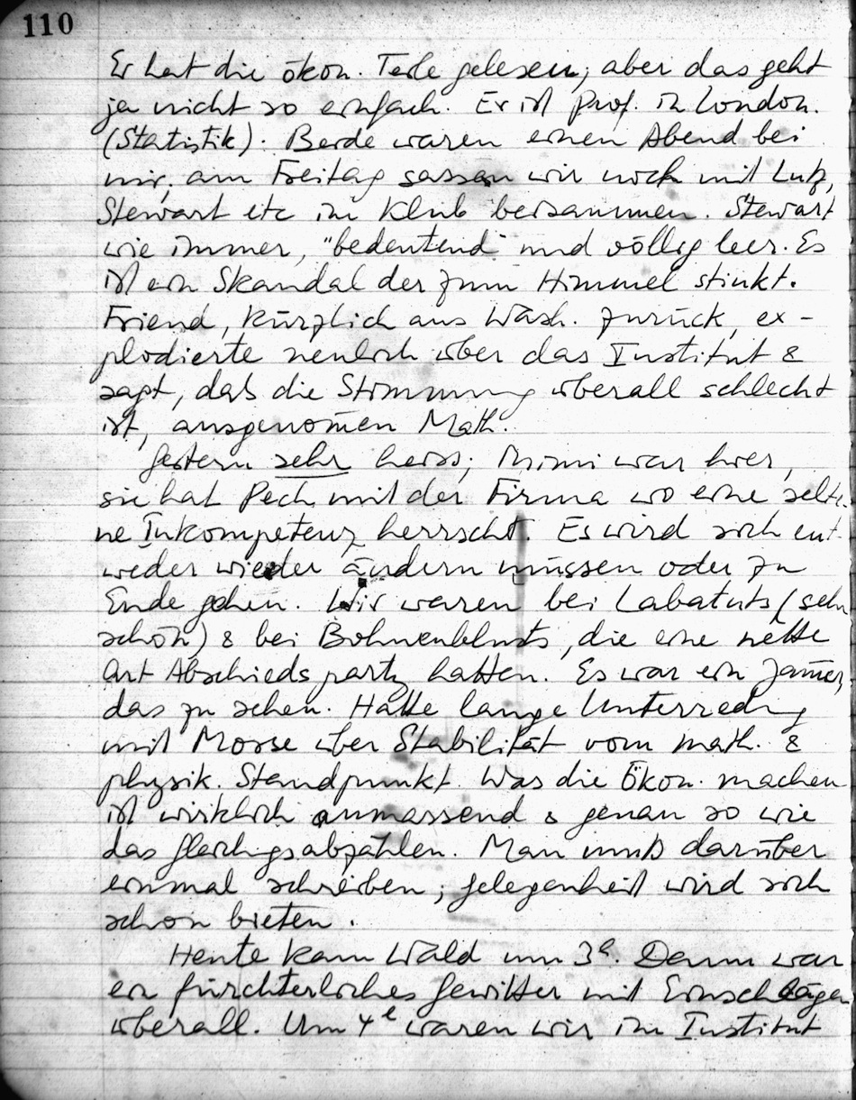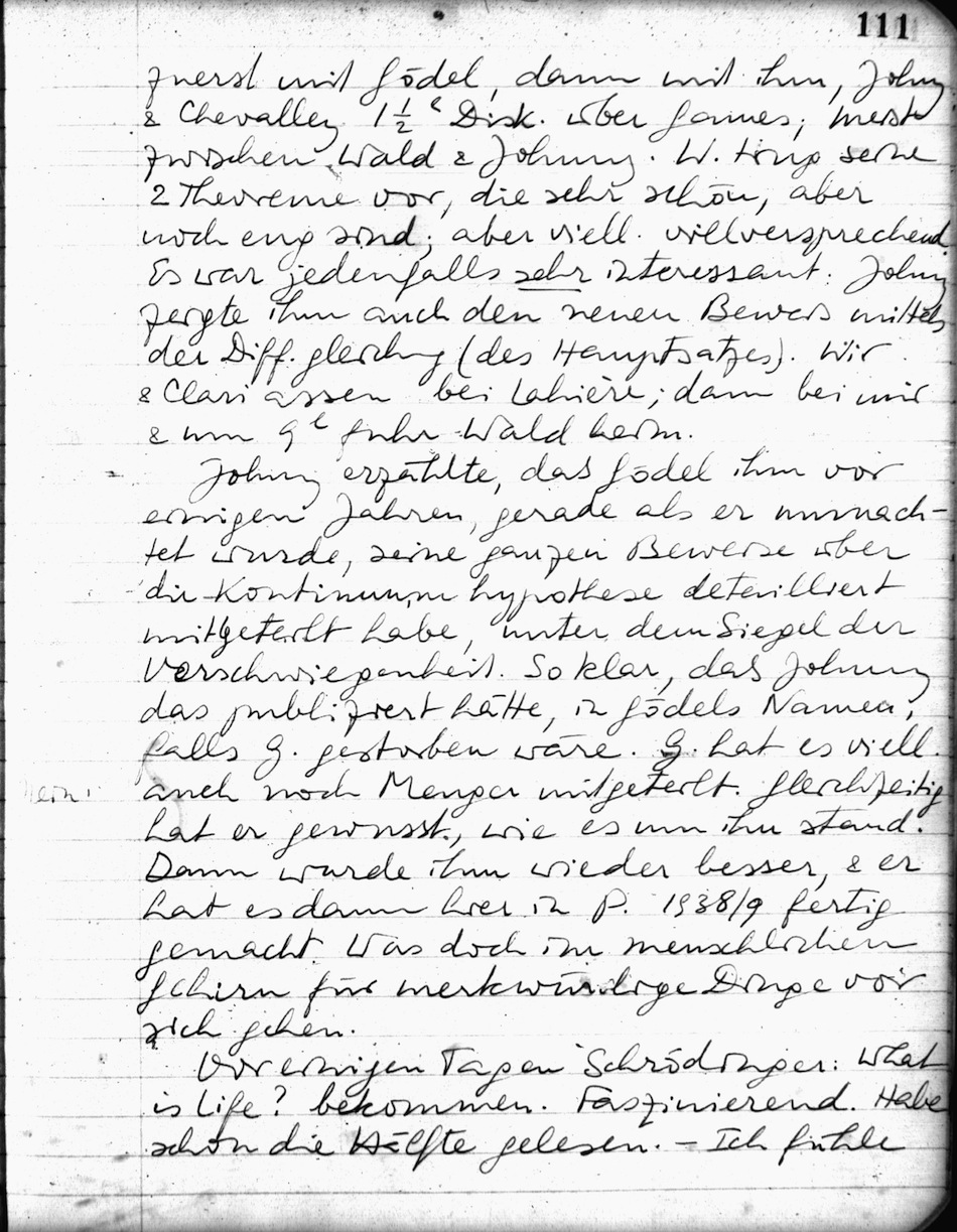 Heute kam Wald um 3h. Dann war ein fürchterliches Gewitter mit Einschlägen überall. Um 4h waren wir im Institut, zuerst mit Gödel, dann mit ihm, Johnny & Chevally 1 ½ h Disk. über Games; meist zwischen Wald & Johnny. W. trug seine 2 Theoreme vor, die sehr schön, aber noch eng sind; aber viell. vielversprechend. Es war jedenfalls sehr interessant. Johnny zeigte ihm auch den neuen Beweis mittels der Diff.gleichung (des Hauptsatzes). Wir & Clari assen bei Lahière; dann bei mir & um 9h fuhr Wald heim.