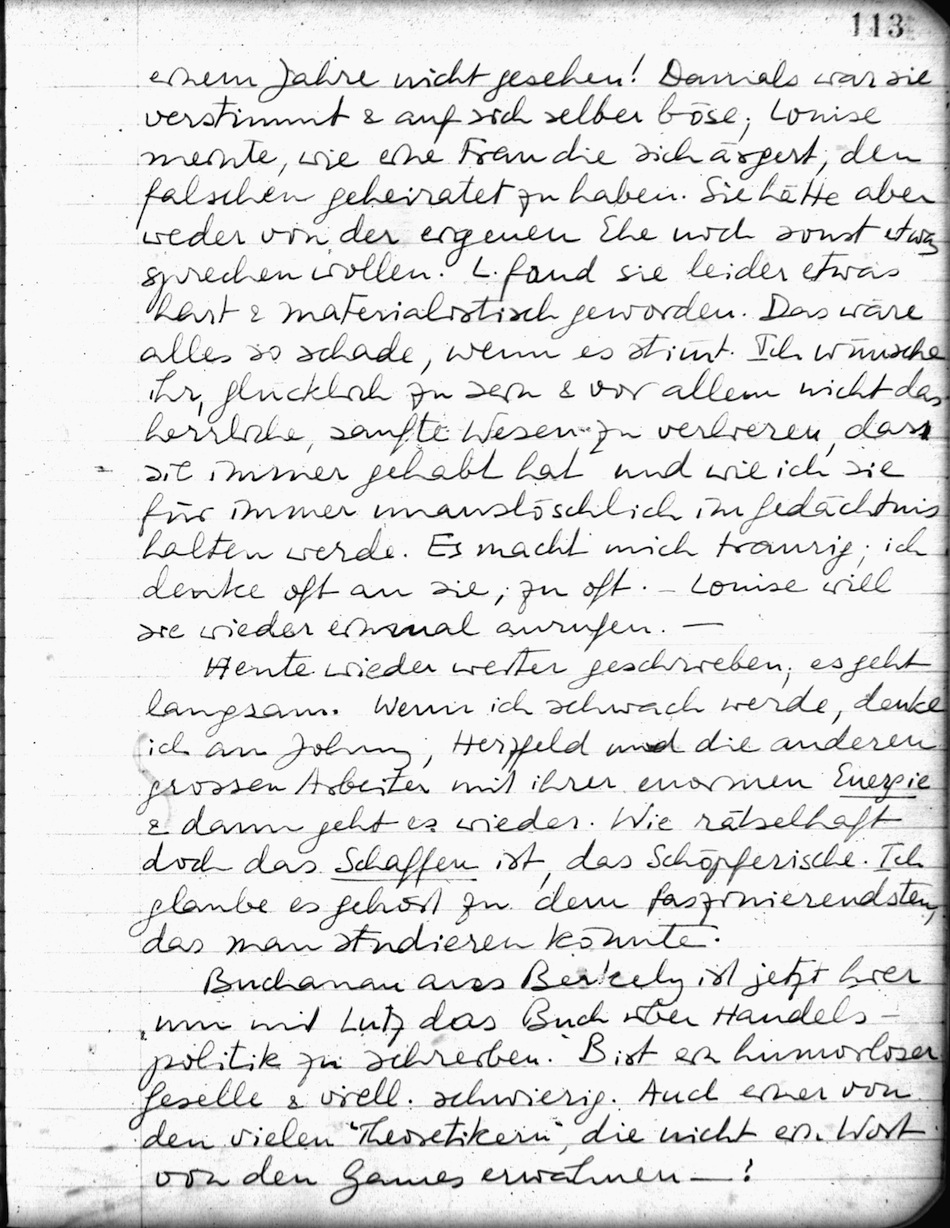 Heute wieder weiter geschrieben, es geht langsam. Wenn ich schwach werde, denke ich an Johnny, Herzfeld und die anderen grossen Arbeiter mit ihrer enormen Energie & dann geht es wieder. Wie rätselhaft doch das Schaffen ist, das Schöpferische. Ich glaube es gehört zu dem faszinierendsten, das man studieren könnte.