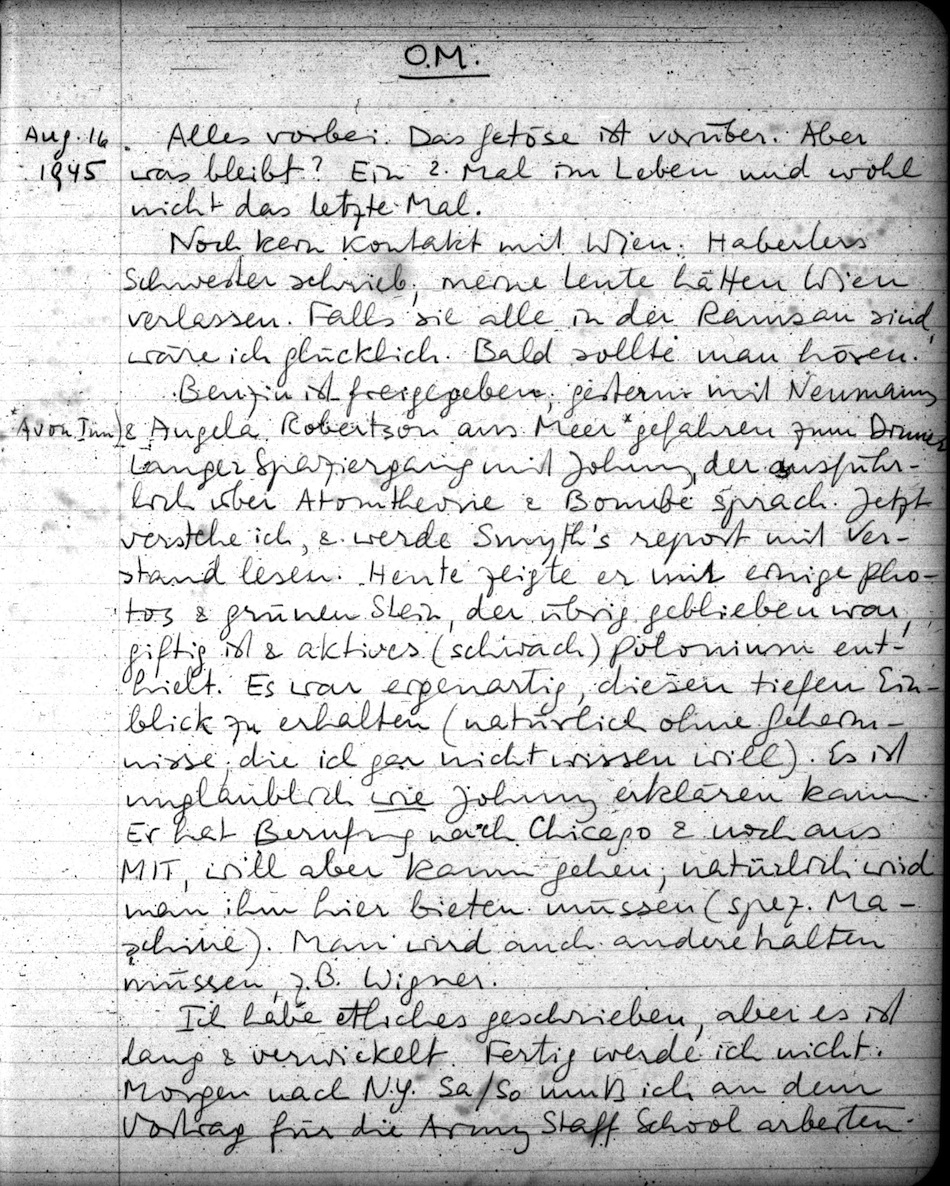 Benzin ist freigegeben; gestern mit Neumanns & Angela Robertson ans Meer1 gefahren zum Dinner. Langer Spaziergang mit Johnny, der ausführlich über Atomtheorie & Bombe sprach. Jetzt verstehe ich, & werde Smyth's report mit Verstand lesen. Heute zeigte er mir einige Photos & grünen Stein, der übrig geblieben war, giftig ist & aktives (schwach) Polonium enthielt. Es war eigenartig, diesen tiefen Einblick zu erhalten (natürlich ohne Geheimnisse; die ich gar nicht wissen will). Es ist unglaublich wie Johnny erklären kann. Er hat Berufung nach Chicago & noch ans MIT, will aber kaum gehen; natürlich wird man ihm hier bieten müssen (spez. Maschine). Man wird auch andere halten müssen, z.B. Wigner.