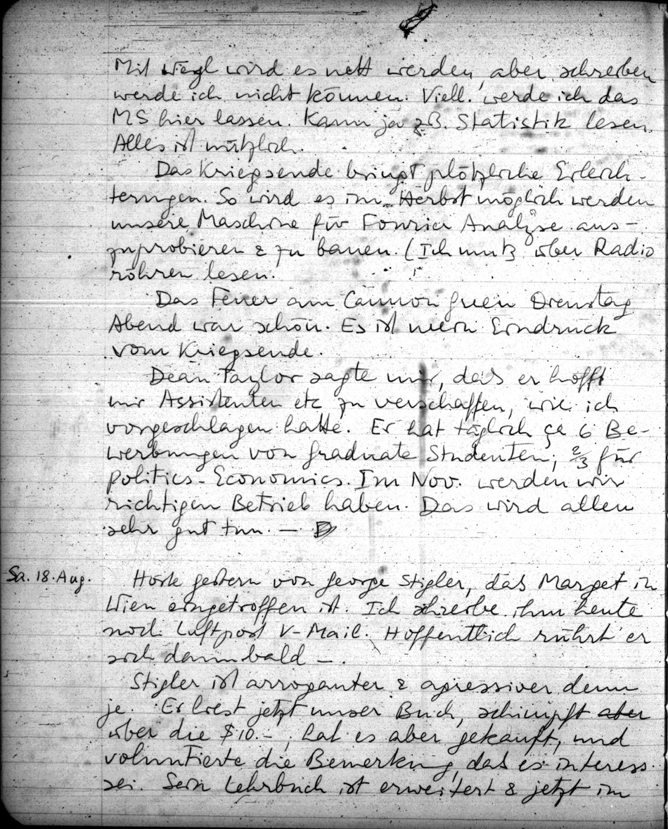 Das Kriegsende bringt plötzliche Erleichterungen. So wird es im Herbst möglich werden unsere Maschine für Fourier Analyse auszuprobieren & zu bauen. (Ich muß über Radioröhren lesen.