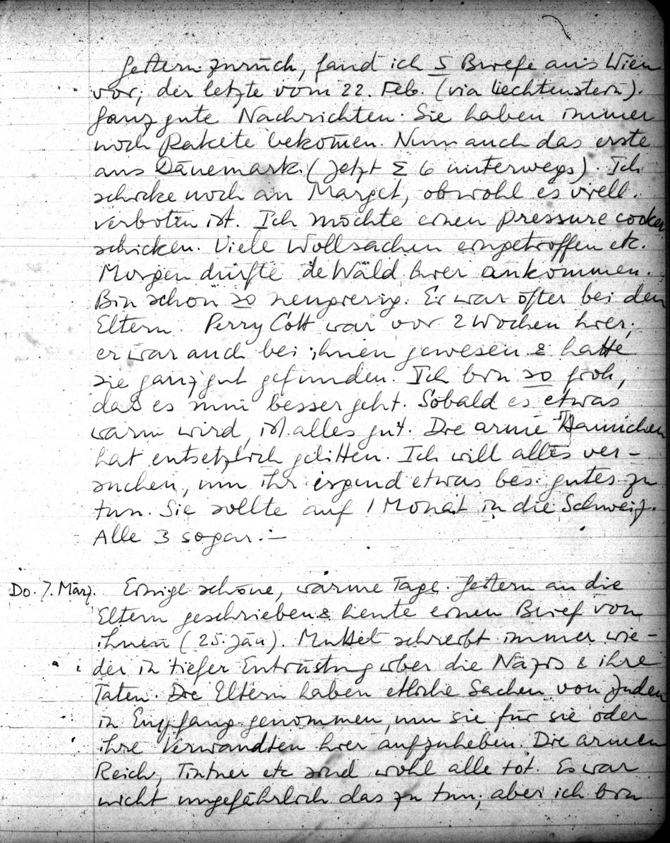 Einige schöne, warme Tage. Gestern an die Eltern geschrieben & heute einen Brief von ihnen (25. Jän). Muttel schreibt immer wieder in tiefer Entrüstung über die Nazis & ihre Taten. Die Eltern haben etliche Sachen von Juden in Empfang genommen, um sie für sie oder ihre Verwandten hier aufzuheben. Die armen Reich, Tintner etc sind wohl alle tot. Es war nicht ungefährlich das zu tun; aber ich bin froh, auch daß sich niemand von uns mit Beitritt zur Nazipartei befleckt hat. Muttel sagt, daß die Annäherung der Russen von ihnen doch als Befreiung vom deutschen Joch empfunden wurde & auch noch heute so gefühlt wird. Mont. fahre ich nach N.Y. und schicke wieder Pakete. DeWald ist in Fort Dix & wird Sonntag hier sein.