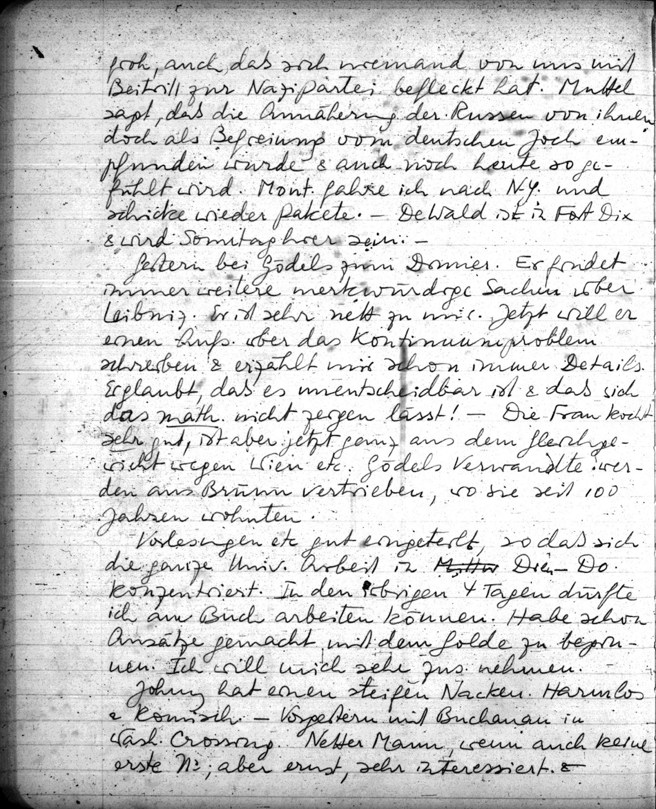 Gestern bei Gödels zum Dinner. Er findet immer weitere merkwürdige Sachen über Leibnitz. Er ist sehr nett zu mir. Jetzt will er einen Aufs. über das Kontinuumproblem schreiben & erzählt mir schon immer Details. Er glaubt, daß es unentscheidbar ist & daß sich das math. nicht zeigen lässt! Die Frau kocht sehr gut, ist aber jetzt ganz aus dem Gleichgewicht wegen Wien etc: Gödels Verwandte werden aus Brünn vertrieben, wo sie seit 100 Jahren wohnten.