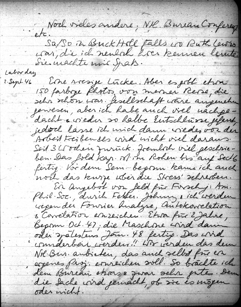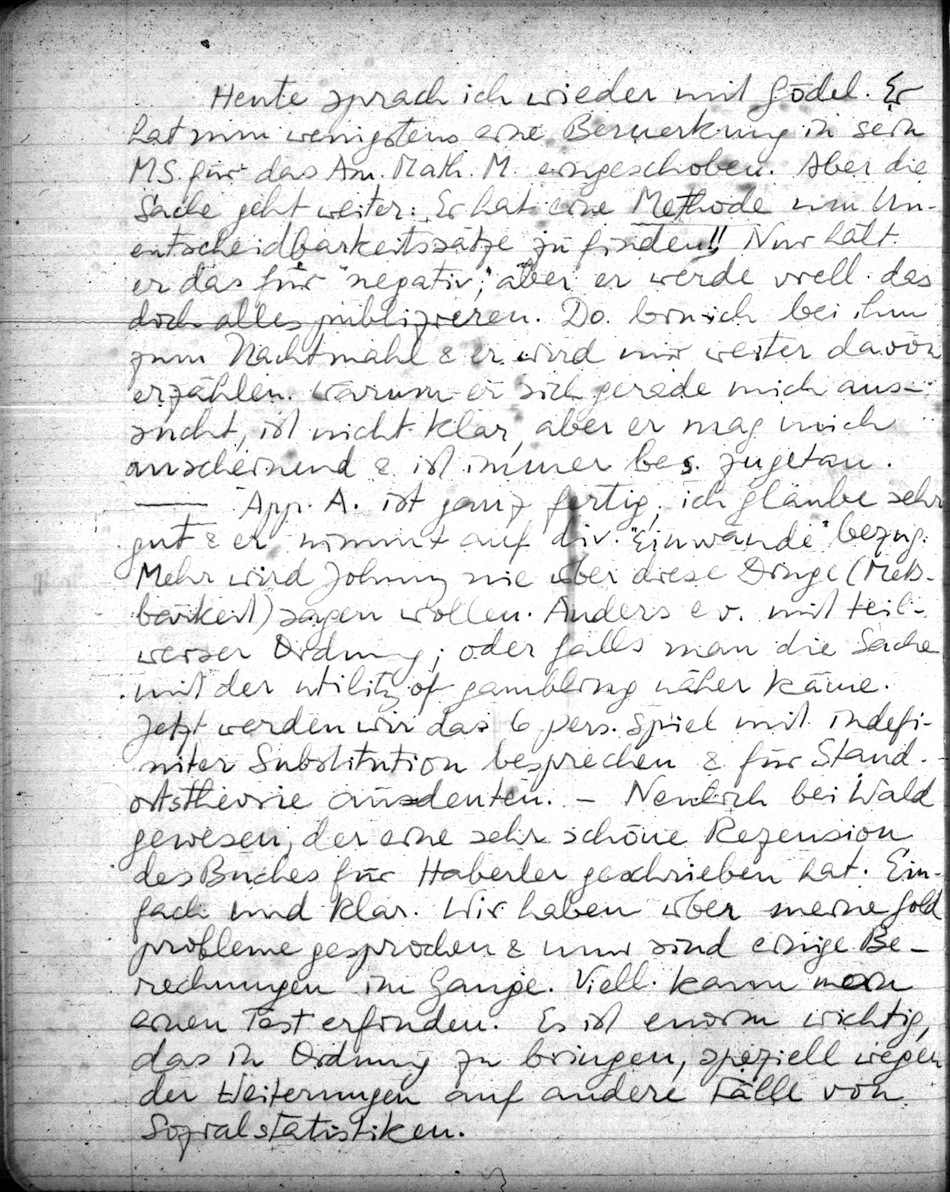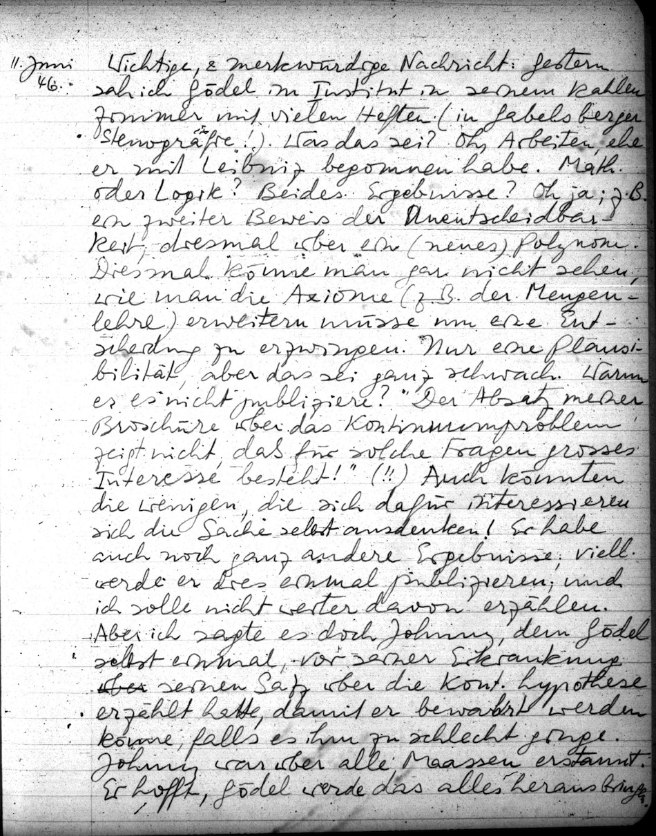 Wichtige, & merkwürdige Nachricht: Gestern sah ich Gödel im Institut in seinem kahlen Zimmer mit vielen Heften (in Gabelsberger Stenografie!). Was das sei? Oh, Arbeiten, ehe er mit Leibniz begonnen habe. Math. oder Logik? Beides Ergebnisse? Oh ja; z.B. ein zweiter Beweis der Unentscheidbarkeit; diesmal über ein (neues) Polynom. Diesmal könne man gar nicht sehen, wie man die Axiome (z.B. der Mengenlehre) erweitern müsse um eine Entscheidung zu erzwingen. Nur eine Plausibilität, aber das sei ganz schwach. Warum er es nicht publiziere? Der Absatz meiner Broschüre über das Kontinuumproblem zeigt nicht, daß für solche Fragen grosses Interesse besteht! (!!) Auch könnten die wenigen, die sich dafür interessieren sich die Sache selbst ausdenken! Er habe auch noch ganz andere Ergebnisse; viell. werde er dies einmal publizieren; und ich solle nicht weiter davon erzählen. Aber ich sagte es doch Johnny, dem Gödel selbst einmal vor seiner Erkrankung seinen Satz über die Kont.hypothese erzählt hatte, damit er bewahrt werden könne, falls es ihm zu schlecht ginge. Johnny war über alle Maassen erstaunt. Er hofft, Gödel werde das alles herausbringen.