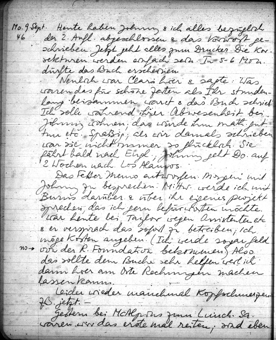 Neulich war Clari hier & sagte: Was waren das für schöne Zeiten als ihr stundenlang beisammen waret & das Buch schrieb. Ich solle während ihrer Abwesenheit bei Johnny wohnen; das würde ihm math. gut tun etc. Spaßig; als wir damals schrieben war sie nicht immer so glücklich. Sie fährt bald nach Engl.; Johnny geht Do. auf 2 Wochen nach Los Alamos.