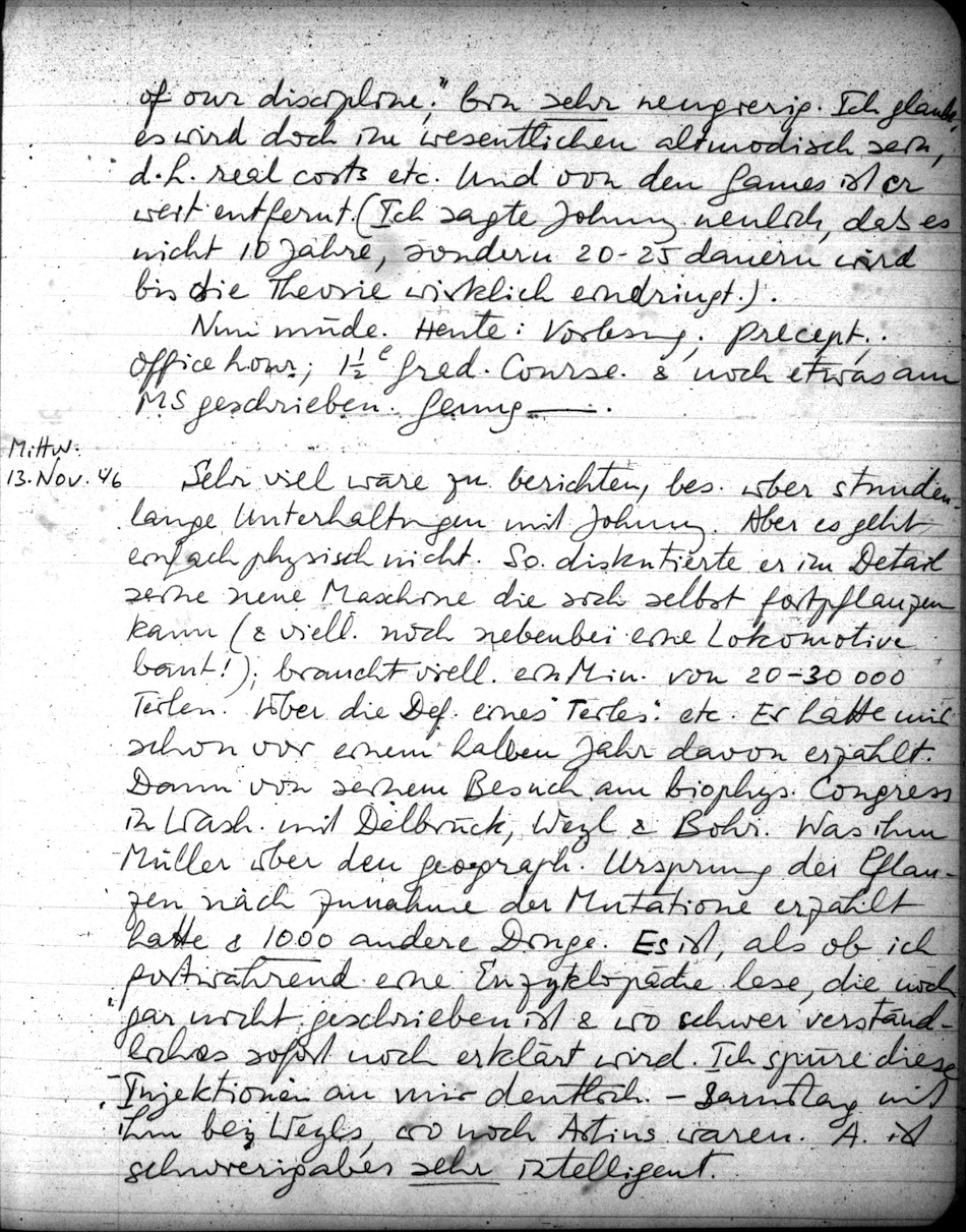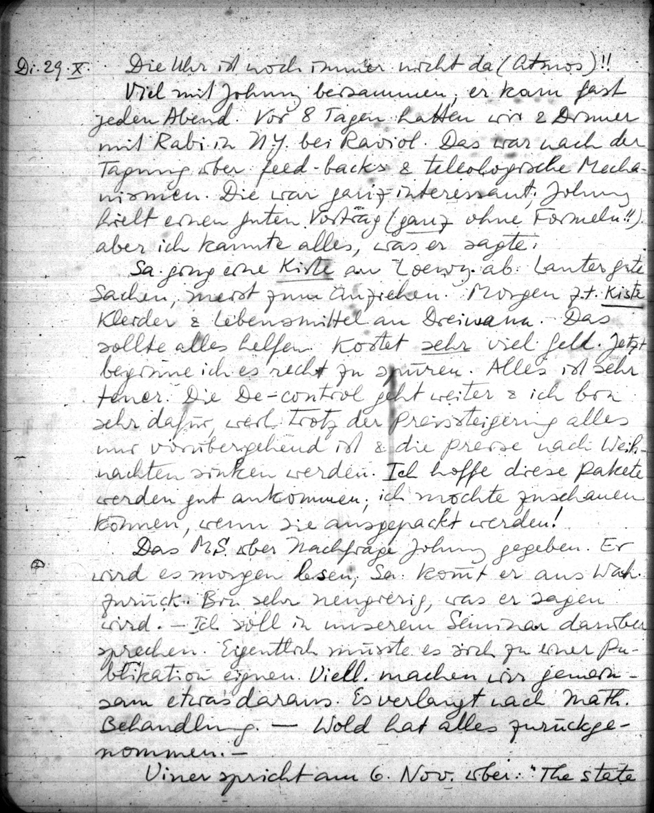 Viel mit Johnny beisammen; er kam fast jeden Abend. Vor 8 Tagen hatten wir 2 Dinner mit Rabi in N.Y. bei Raviol. Das war nach der Tagung über feed-backs & teleologische Mechanismen. Die war ganz interessant; Johnny hielt einen guten Vortrag (ganz ohne Formeln!!), aber ich kannte alles, was er sagte.