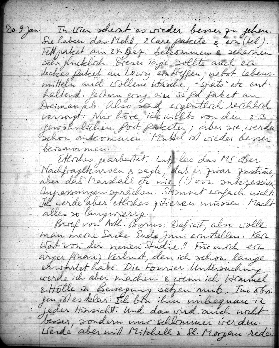 In Wien scheint es wieder besser zu gehen. Sie haben das Mehl, 2 Care Pakete & ein (tel). Fettpaket am 24. Dez. bekommen & scheinen sehr glücklich. Dieser Tage sollte auch ein dickes Paket an Löwy eintreffen; nebst Lebensmitteln auch wollene Wäsche, "spats" etc. enthaltend. Gestern ging ein 55 Pd Paket an Dreiman ab. Also sind eigentlich reichlich versorgt: Nur höre ich nichts von den 2-3 gewöhnlichen Post Paketen; aber sie werden schon ankommen. Muttel ist wieder besser beisammen.