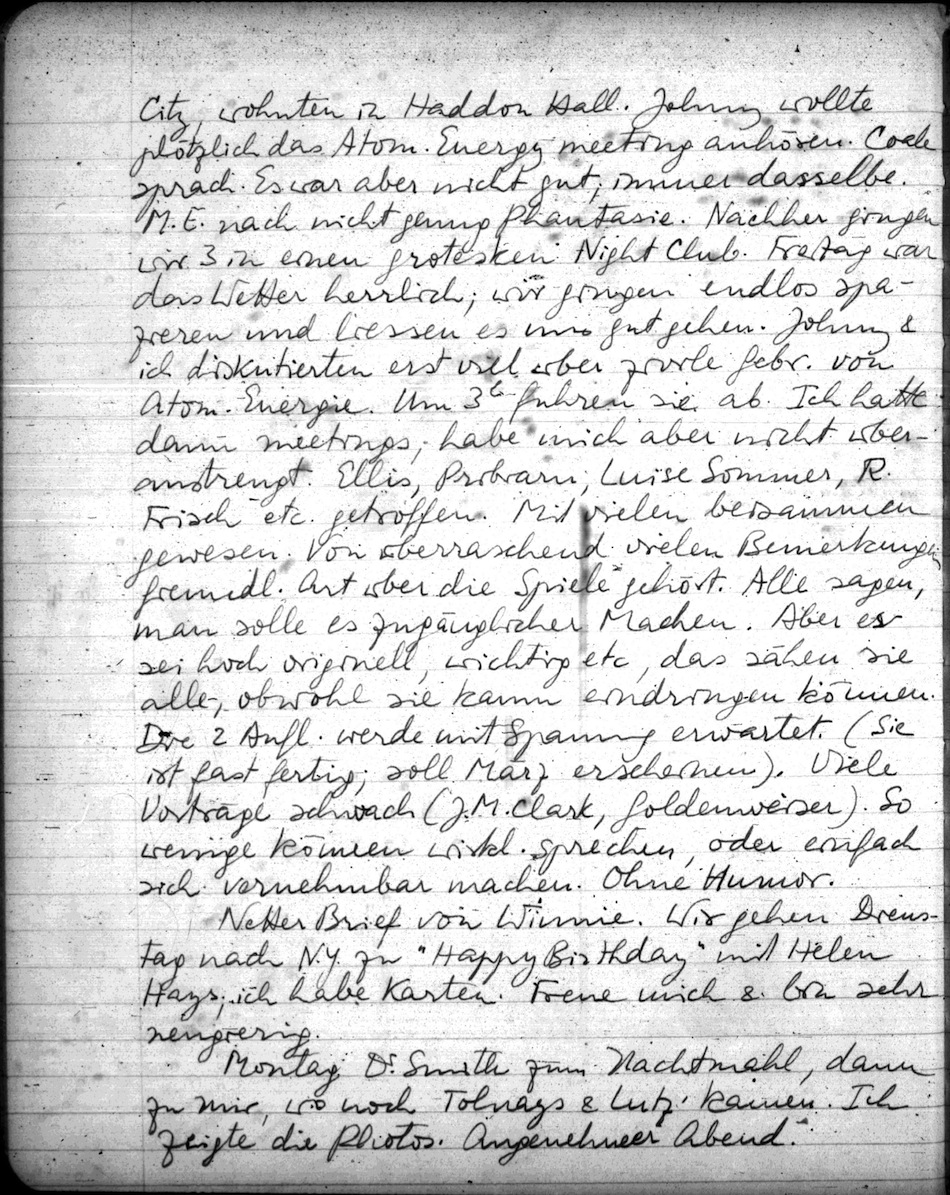 Do. fuhr ich mit Johnny & Clari nach Atlantic City, wohnten in Haddon Hall. Johnny wollte plötzlich das Atom. Energy meeting anhören. Coale sprach. Es war aber nicht gut; immer dasselbe. M.E. noch nicht genug Phantasie. Nachher gingen wir 3 in einen grotesken Night Club. Freitag war das Wetter herrlich; wir gingen endlos spazieren und liessen es uns gut gehen. Johnny & ich diskutierten erst viel über zivile Gebr. von Atom. Energie. Um 3h fuhren sie ab. Ich hatte dann meetings; habe mich aber nicht überanstrengt. Ellis, Pribram, Luise Sommer, R. Frisch etc. getroffen. Mit vielen beisammen gewesen. Von überraschend vielen Bemerkungen freundl. Art über die Spiele gehört. Alle sagen, man solle es zugänglicher machen. Aber es sei hoch originell, wichtig etc, das sähen sie alle, obwohl sie kaum eindringen können. Die 2 Aufl. werde mit Spannung erwartet. (Sie ist fast fertig; soll März erscheinen.) Viele Vorträge schwach (J.M. Clark, Goldenweiser). So wenige können wirkl. sprechen, oder einfach sich vernehmbar machen. Ohne Humor.