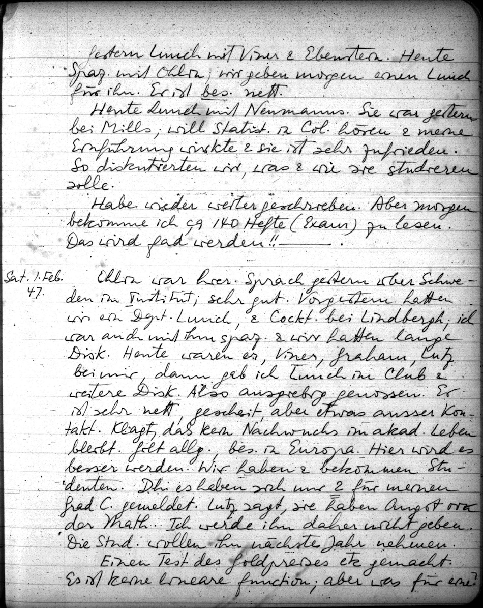 Heute Lunch mit Neumanns. Sie war gestern bei Mills; will Statist. in Col. hören & meine Einführung wirkte & sie ist sehr zufrieden. So diskutierten wir, was & wie sie studieren solle.