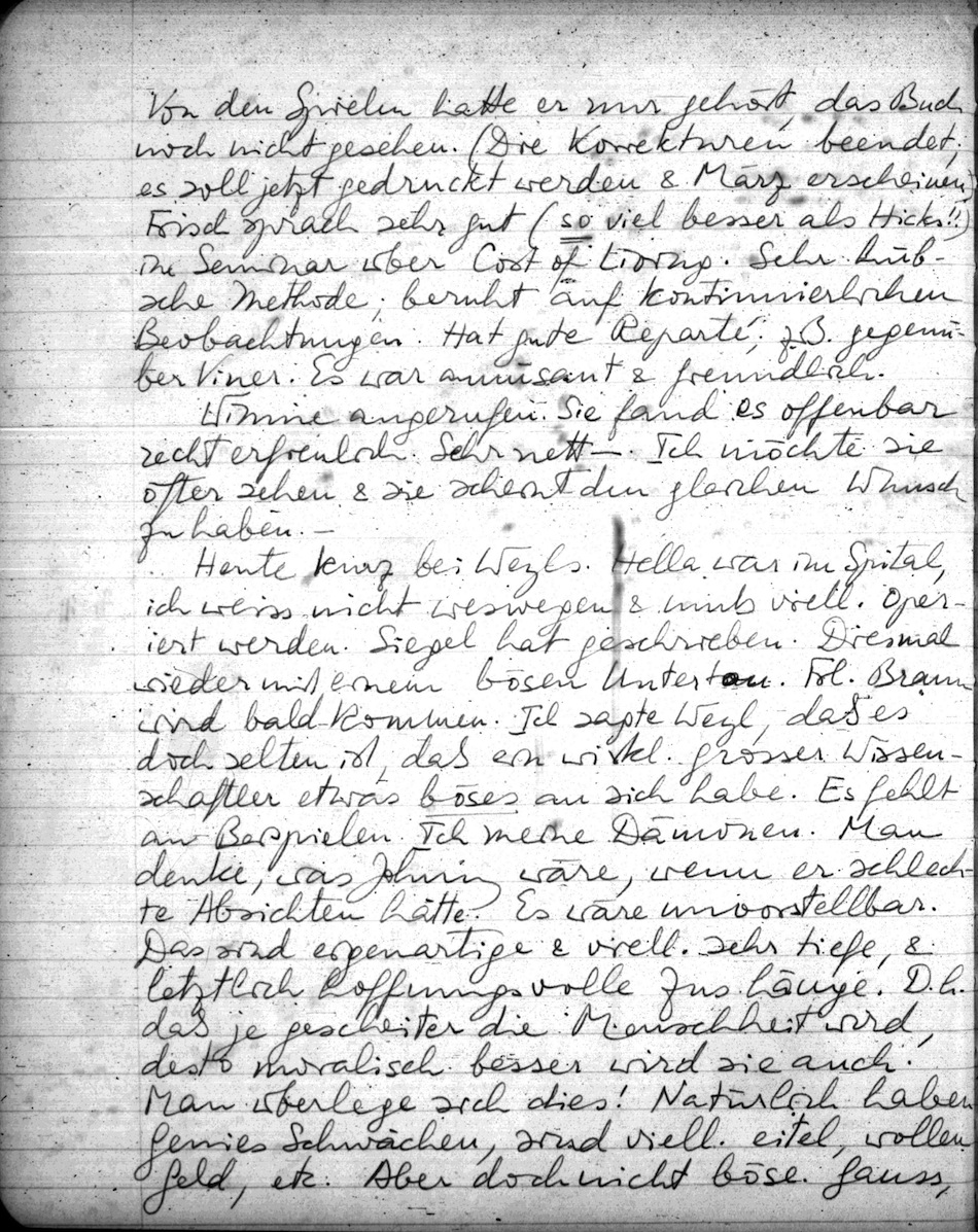 Heute kurz bei Weyls. Hella war im Spital, ich weiss nicht weswegen & muß viell. operiert werden. Siegel hat geschrieben. Diesmal wieder mit einem bösen Unterton. Frl. Braun wird bald kommen. Ich sagte Weyl, daß es doch selten ist, daß ein wirkl. grosser Wissenschaftler etwas böses an sich habe. Es fehlt an Beispielen. Ich meine Dämonen. Man denke, was Johnny wäre, wenn er schlechte Absichten hätte. Es wäre unvorstellbar. Das sind eigenartige & viell. sehr tiefe, & letztlich hoffnungsvolle Zus.hänge. D.h. daß je gescheiter die Menschheit wird, desto moralisch besser wird sie auch. Man überlege sich dies! Natürlich haben Genies Schwächen, sind viell. eitel, wollen Geld, etc. Aber doch nicht böse. Gauss, Mozart, und so viele andere waren doch bes. reizend, gütig etc. Manche Genies sind auch leicht verrückt; aber das ist wieder etwas anderes.