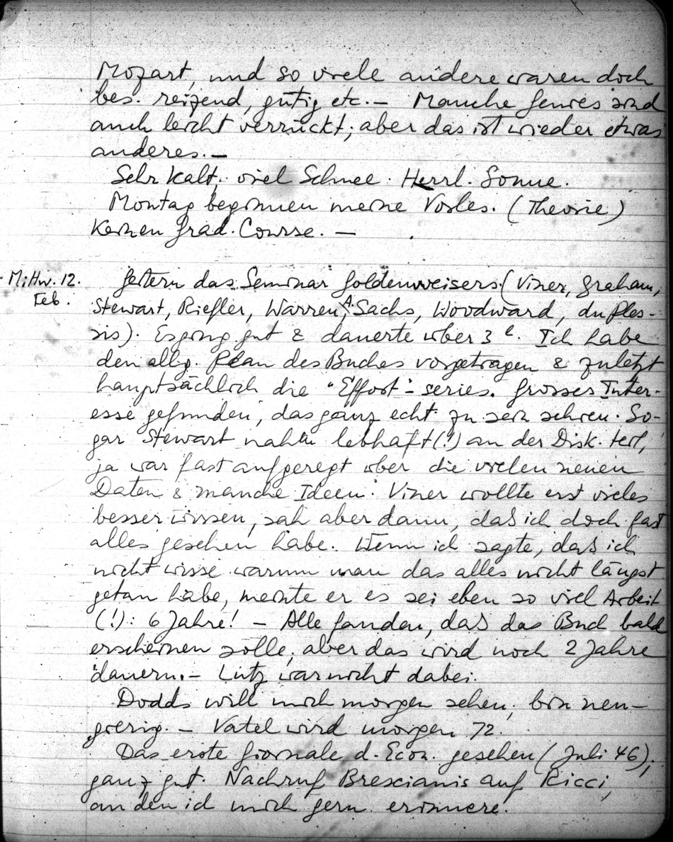 Von den Spielen hatte er nur gehört, das Buch noch nicht gesehen. (Die Korrekturen beendet; es soll jetzt gedruckt werden & März erscheinen). Frisch sprach sehr gut (so viel besser als Hicks!!) im Seminar über Cost of Living. Sehr hübsche Methode; beruht auf kontinuierlichen Beobachtungen. Hat gute Reparté; z.B. gegenüber Viner. Es war amüsant & freundlich.