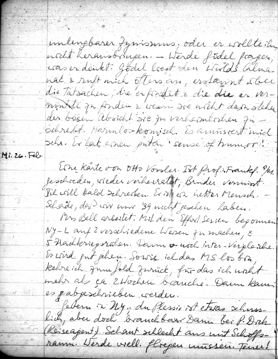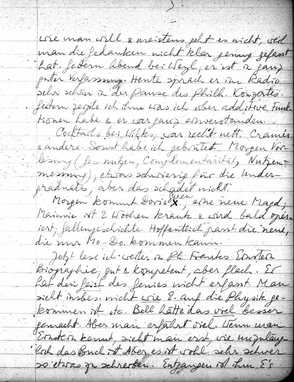 Jetzt lese ich weiter im Ph. F Einstein Biographie; gut & kompetent, aber falsch. Er hat den Geist des Genies nicht erfasst. Man sieht insbes. nicht wie E. auf die Physik gekommen ist etc. Bell hätte das viel besser gemacht. Aber man erfährt viel. Wenn man Einstein kennt, sieht man erst, wie unzulänglich das Buch ist. Aber es ist wohl sehr schwer, so etwas zu schreiben. Entgangen ist ihm E's unleugbarer Zynismus; oder er wollte ihn nicht herausbringen. Werde Gödel fragen, was er denkt. Gödel liest den World's Almanach & ruft mich öfters an, erstaunt über die Tatsachen, die er findet & die die er vermutete zu finden & wenn sie nicht drin stehen, der bösen Absicht sie zu verheimlichen zuschreibt. Harmlos-komisch. Es amüsiert mich sehr. Er hat einen guten "sense of humor".