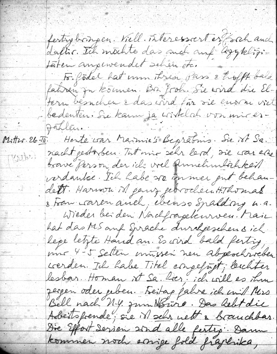 Heute war Maimie's Begräbnis. Sie ist Sa.nacht gestorben. Tut mir sehr leid, sie war eine brave Person, der ich viel Annehmlichkeit verdanke. Ich habe sie immer gut behandelt. Harnon ist ganz gebrochen. H. Thomas & Frau waren auch; ebenso Spalding u.a.