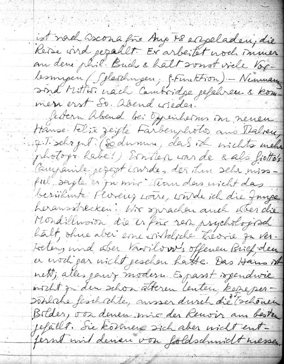 Gestern Abend bei Oppenheims im neuen Haus. Felix zeigte Farbenphotos aus Italien, z.T. sehr gut. (So dumm, daß ich nichts mehr photogr. habe!) Einstein war da & als Giotto's Campanile gezeigt wurde, der ihm sehr missfiel, sagte er zu mir: "Wenn das nicht das berühmte Florenz wäre, würde ich die Zunge herausstrecken". Wir sprachen auch über die Mondillusion, die er für rein psychologisch hält, ohne aber eine wirkliche Theorie zu vertreten, und über Vavilow's offenen Brief, den er noch gar nicht gesehen hatte. Das Haus ist nett; alles ganz modern. Es passt irgendwie nicht zu den schon älteren Leuten; keine persönliche Geschichte, ausser durch die z.T. schönen Bilder, von denen mir der Renoir am besten gefällt. Sie können sich aber nicht entfernt mit denen von Goldschmidt messen.