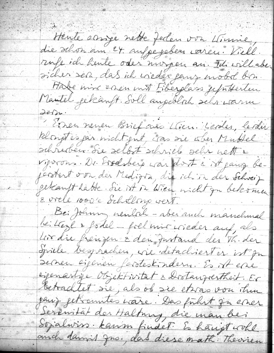 Bei Johnny neulich aber auch manchmal bei Weyl & Gödel fiel mir wieder auf, als wir die Grenzen & den Zustand der Th. der Spiele besprachen, wie detachiert er ist zu seinen eigenen Geisteskindern. Es ist eine eigenartige Objektivität & Distanziertheit. Er betrachtet sie, als ob sie etwas von ihm ganz getrenntes wäre. Das führt zu einer Serenität der Haltung, die man bei Sozialwiss. kaum findet. Es hängt wohl auch damit zus., daß dies math. Theorien eben viel fertiger, abgeschlossener sind, als sozialwiss., obwohl die Ökon. das für ihre Kinder viell. nur im Unterbewusstsein spüren. Da wird alles so persönlich; eine Glaubenssache, "Schule", mit "Treue" & "Verrat" etc. Mir fiel letzteres bei Mayer in Wien besonders auf, als ich ihn im Sommer sah. Aber auch bei bedeutenderen Vertretern ihres Faches gilt es.