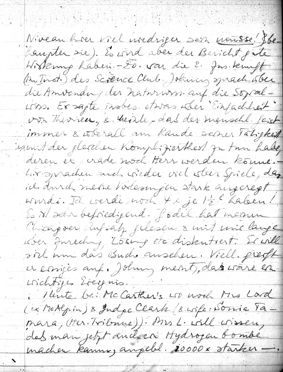 Viel mit Johnny beisammen gewesen. (Morgen fahren sie beide nach L Al.) Ich habe nun um ein Jahr als Sabattical eingereicht & Johnny sagt, daß ich bestimmt den Rest des Gehaltes vom Inst. bekommen werde, da wir doch zus.arbeiten wollen. Nun muß die Univ. handeln. Gestern Abend Fac. Meeting im Grad. Coll. Disk. eines Berichtes über Res. & Scholarship in P. Gut, mit einem phantastischen Denkfehler, den ich in der Disk. darlegte (daß in 20 Jahren das Niveau hier viel niedriger sein müsse! (behaupten sie). Es wird aber der Bericht gute Wirkung haben. Do. war die 2. Zus.kunft (im Inst.) des Science Club. Johnny sprach über die Anwendung der Naturwiss. auf die Sozialwiss. Er sagte insbes. etwas über "Einfachheit" von Theorien, & meinte, daß der menschl. Geist immer & überall am Rande seiner Tätigkeit es mit der gleichen Kompliziertheit zu tun habe, deren er gerade noch Herr werden könne. Wir sprachen auch wieder viel über Spiel, da ich durch meine Vorlesungen stark angeregt wurde. Ich werde noch 4 x je 1 ½h haben! Es ist sehr befriedigend. Gödel hat meinen Chicagoer Aufsatz gelesen & mit mir lange über Zurechnung, Lösung etc. diskutiert. Er will sich nun das Buch ansehen. Viell. greift er einiges auf. Johnny meint, das wäre ein wichtiges Ereignis.