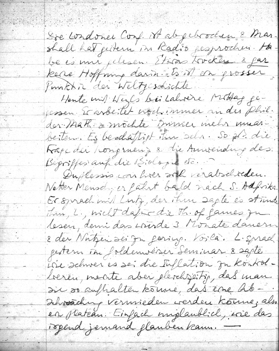 Die Londoner Conf. ist abgebrochen & Marshall hat gestern im Radio gesprochen. Habe es nur gelesen. Etwas trocken & gar keine Hoffnung darin. Es ist ein grosser Punkt in der Weltgeschichte.
