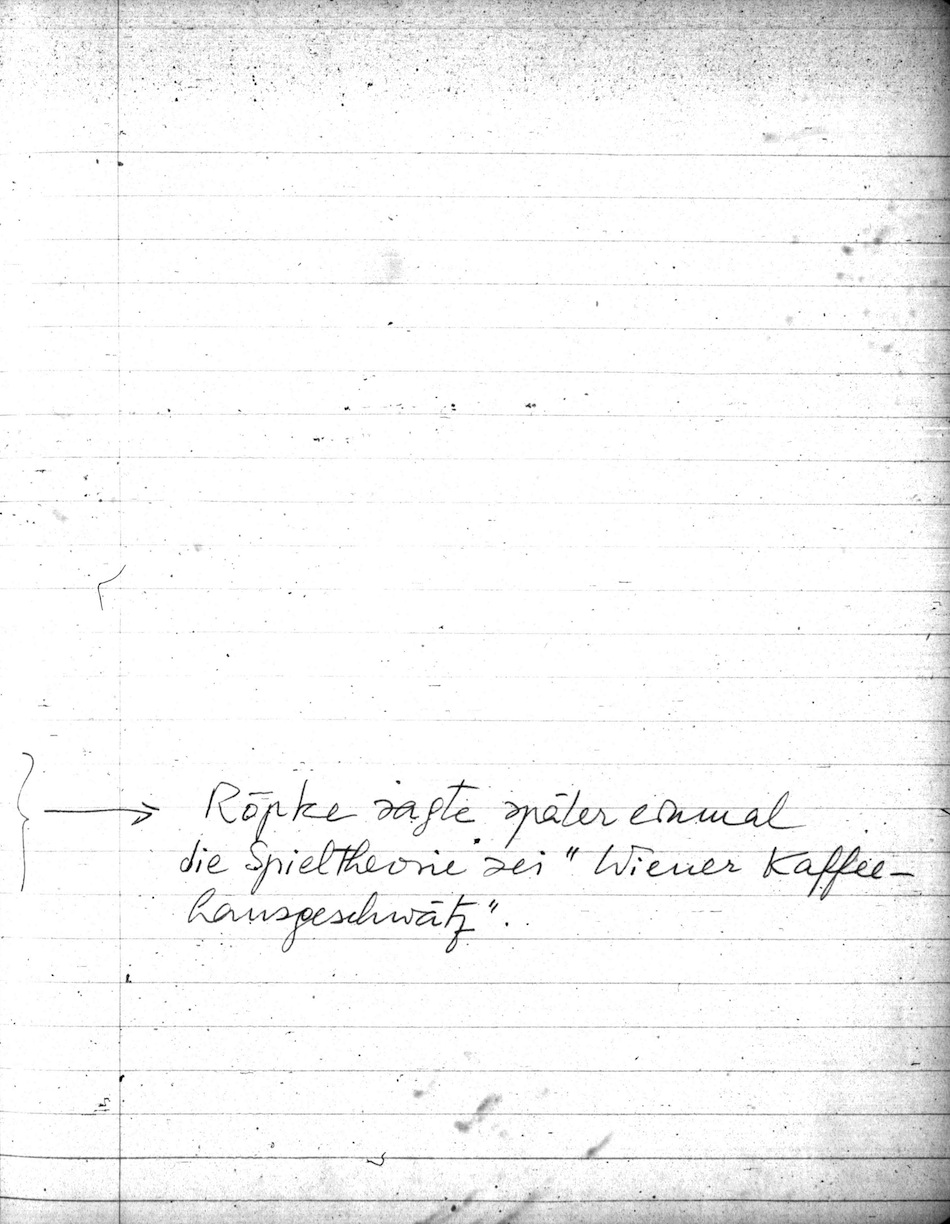 Du Plessis war hier sich verabschieden. Netter Mensch; er fährt bald nach S. Afrika. Er sprach mit Lutz, der ihm sagte es stünde ihm, L., nicht dafür die Th. of Games zu lesen, denn das würde 3 Monate dauern & der Nutzen sei zu gering. Voilà.4 L. sprach gestern im Goldenweiser Seminar & sagte, wie schwer es sei die Inflation zu kontrollieren, meinte aber gleichzeitig, daß man sie so aufhalten könne, daß eine Abschwächung vermieden werden könne; also ein Plateau. Einfach unglaublich, wie das irgend jemand glauben kann. -