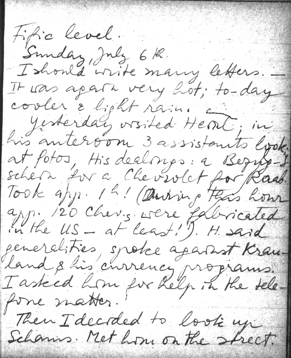 Yesterday visited Heinl; in his anteroom 3 assistants look at fotos, His dealings: a Bezugsschein for a Chevrolet for Raab. Took app. 1h! (During this hour app. 120 Chev.s were fabricated in the US - at least!). H. said generalities, spoke against Krauland & his currency programs. I asked him for help in the telefone matter.