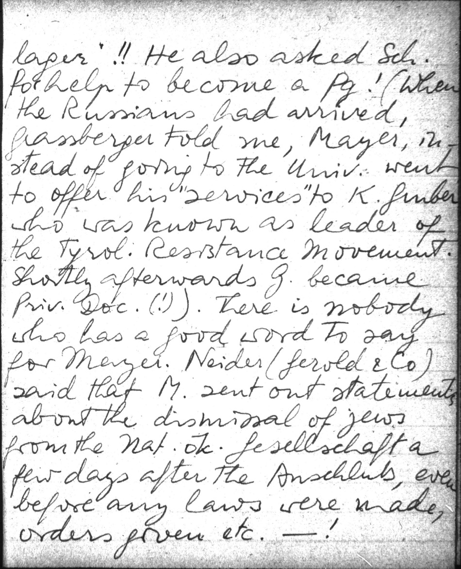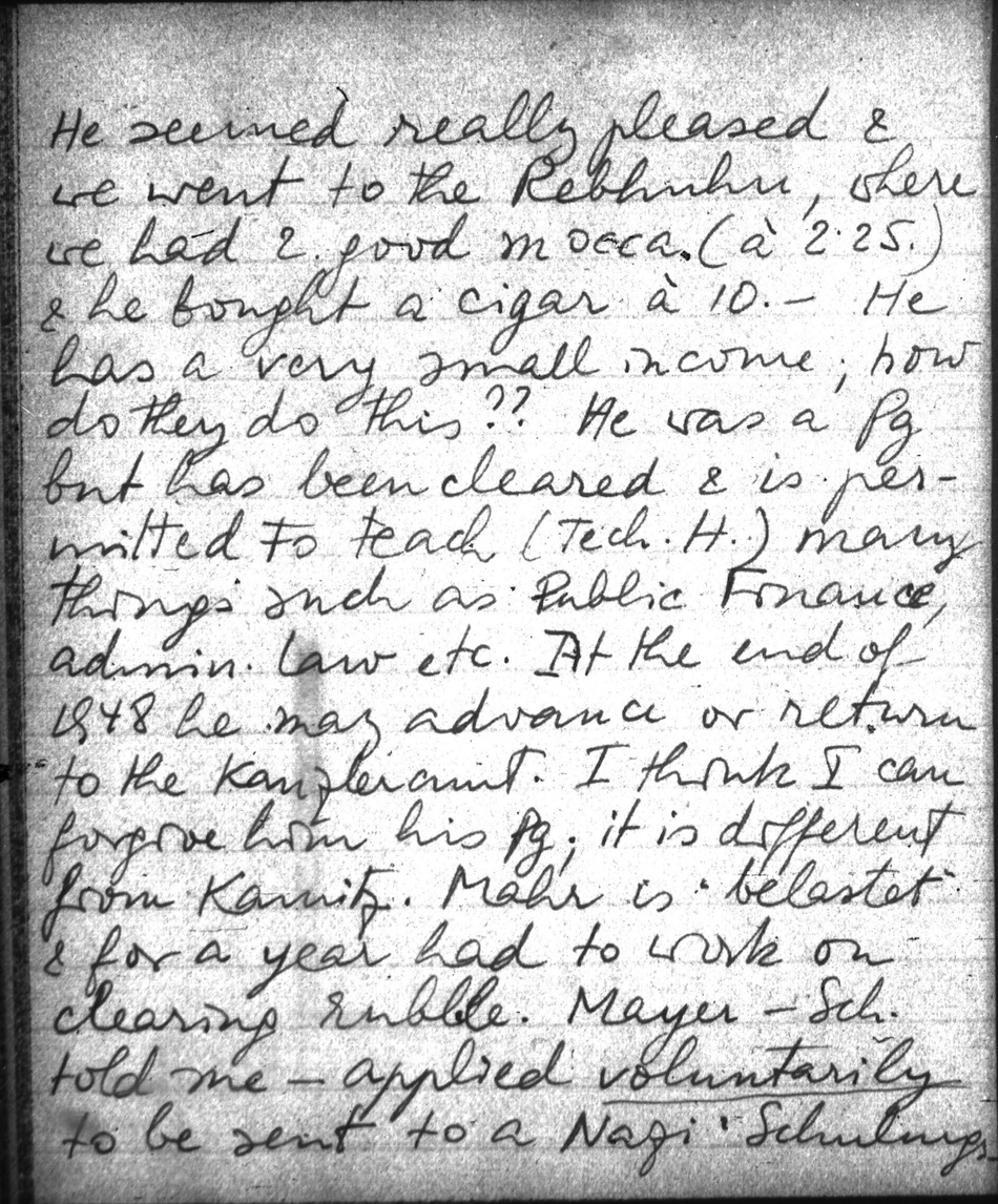 Then I decided to look up Schams. Met him on the street. He seemed really pleased & we went to the Rebhuhn, where we had 2 good mocca (à 2.25.) & he bought a cigar à 10.- He has a very small income; how do they do this?? He was a Pg but has been cleared & is permitted to teach (Tech.H.) many things such as Public Finance, admin. law etc. At the end of 1948 he may advance or return to the Kanzleramt. I think I can forgive him his Pg; it is different from Kamitz. Mahr is belastet & for a year had to work on clearing rubble. Mayer - Sch. told me applied voluntarily to be sent to a Nazi Schulungslager!! He also asked Sch. for help to become a Pg! (When the Russians had arrived, Grassberger told me, Mayer, instead of going to the Univ. went to offer his services to K. Gruber who was known as leader of the Tyrol. Resistance Movement. Shortly afterwards G. became Priv. Doc. (!)). There is nobody who has a good word to say for Mayer. Neider (Gerold & Co) said that M. sent out statements about the dismissal of jews from the Nat. ök. Gesellschaft a few days after the Anschluß, even before any laws were made, orders given etc. - !