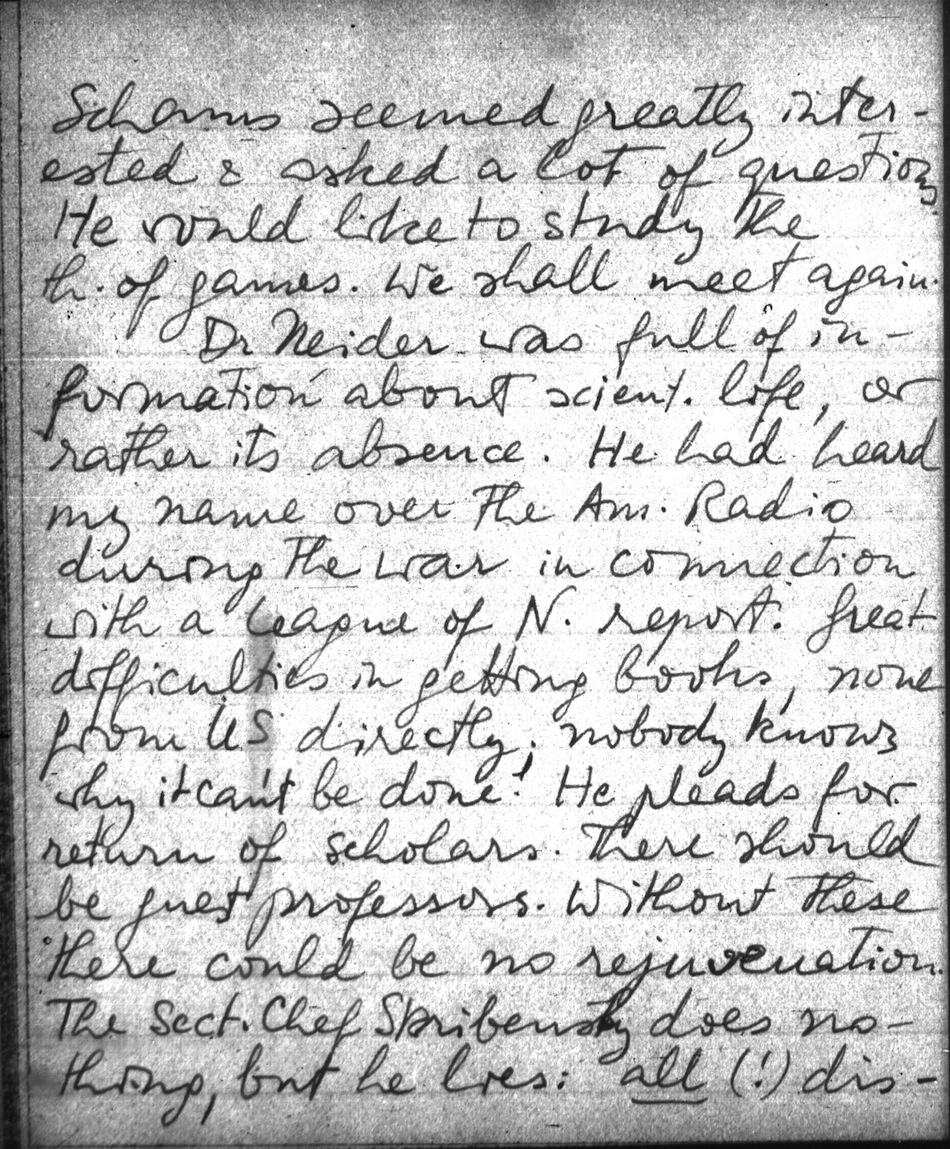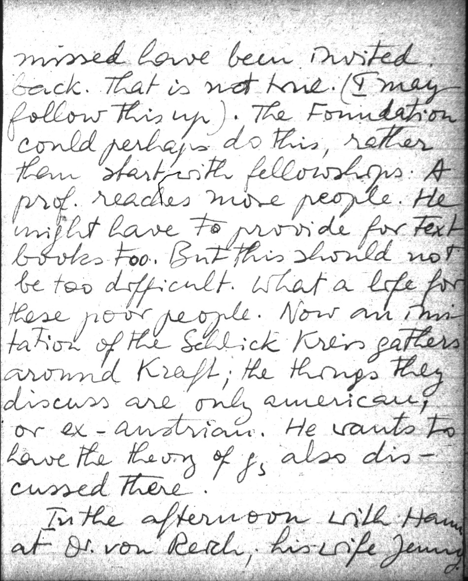Dr Neider was full of information about scient. life, or rather its absence. He had heard my name over the Am. Radio during the war in connection with a League of N. report. Great difficulties in getting books, none from the US directly; nobody knows why it can´t be done. He pleads for return of scholars. There should be guest professors. Without these there could be no rejuvenation. The Sect. Chef Skribensky does nothing, but he lies: all (!) dismissed have been invited back. That is not true. (I may follow this up). The Foundation could perhaps do this, rather than start with fellowships. A prof. reaches more people. He might have to provide for textbooks too. But this should not be too difficult. What a life for these poor people. Now an invitation of the Schlick Kreis gathers around Kraft; the things they discuss are only american, or ex-austrian. He wants to have the theory of g, also discussed there.