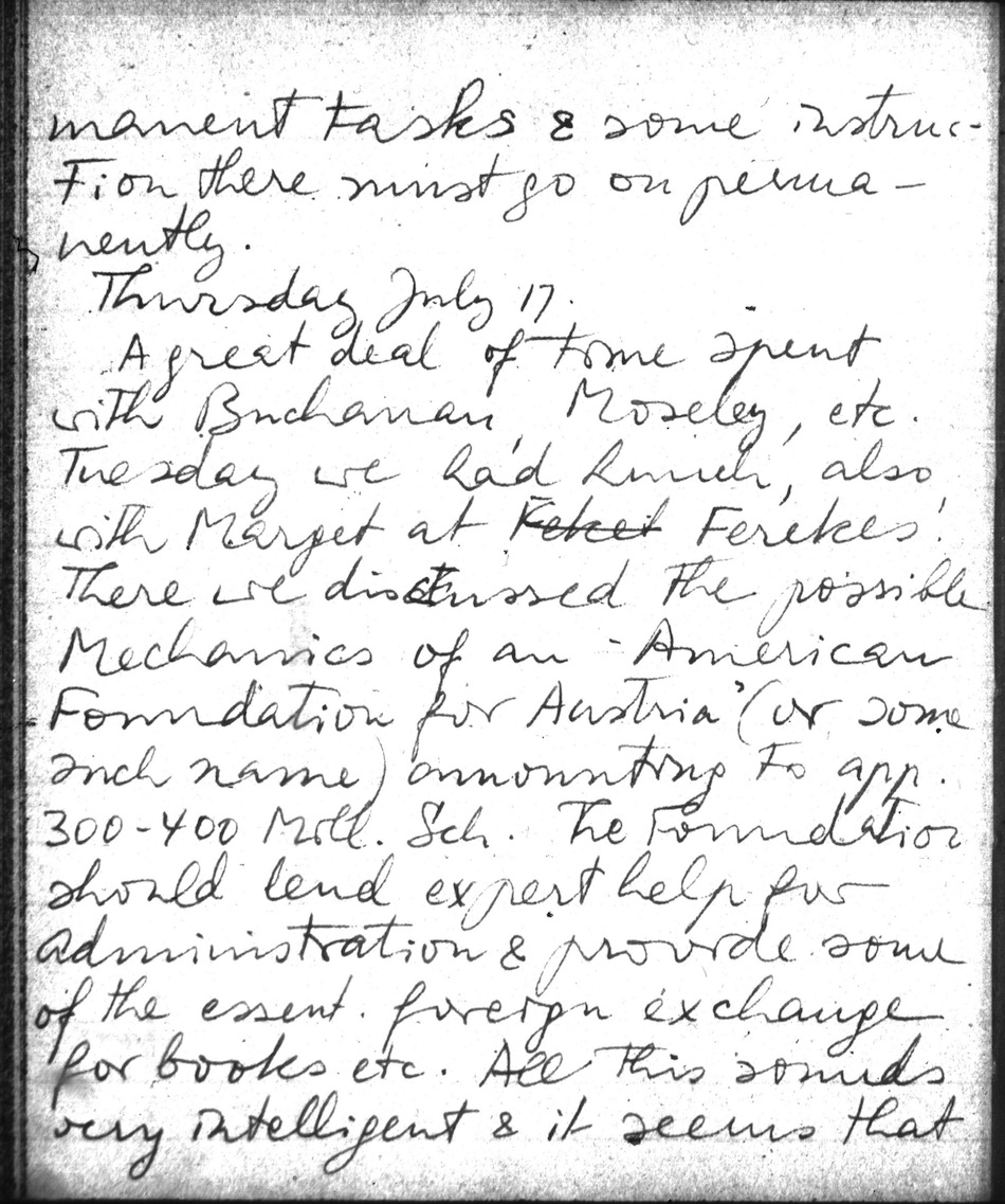 A great deal of time spent with Buchanan, Moseley, etc. Tuesday we had Lunch, also with Marget at Ferekes! There we discussed the possible Mechanics of an American Foundation for Austria (or some such name) amounting to app. 300-400 Mill. Sch. The Foundation should lend expert help for administration & provide some of the essent. foreign exchange for books etc. All this sounds very intelligent & it seems that it could be done. Keyes has full authority to dispose of these funds which originated from the sale of am. gifts to Austria. It would not be easy to invest this money; there are no gov. bonds. One should by buildings, farms etc. They could at the same time be run as model farms etc.