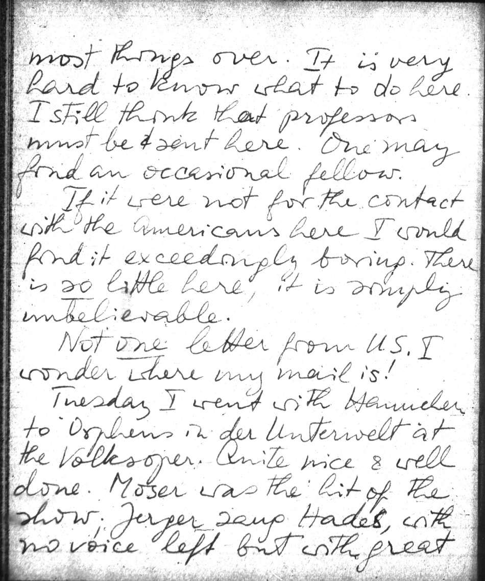 Not one letter from US. I wonder where my mail is! Tuesday I went with Hannchen to Orpheus in der Unterwelt at the Volksoper. Quite nice & well done. Moser was the hit of the show; Jerger sang Hades, with no voice left but with great art. He was a great singer once & still looks magnificent. Many pretty girls as dancers. H. & I had first dinner early at the Regina & Ice cream after the theater. There we saw Wendt.