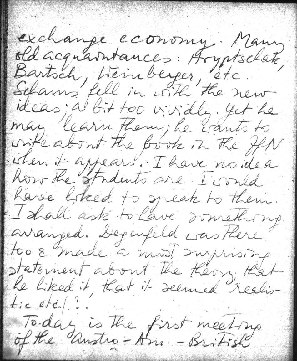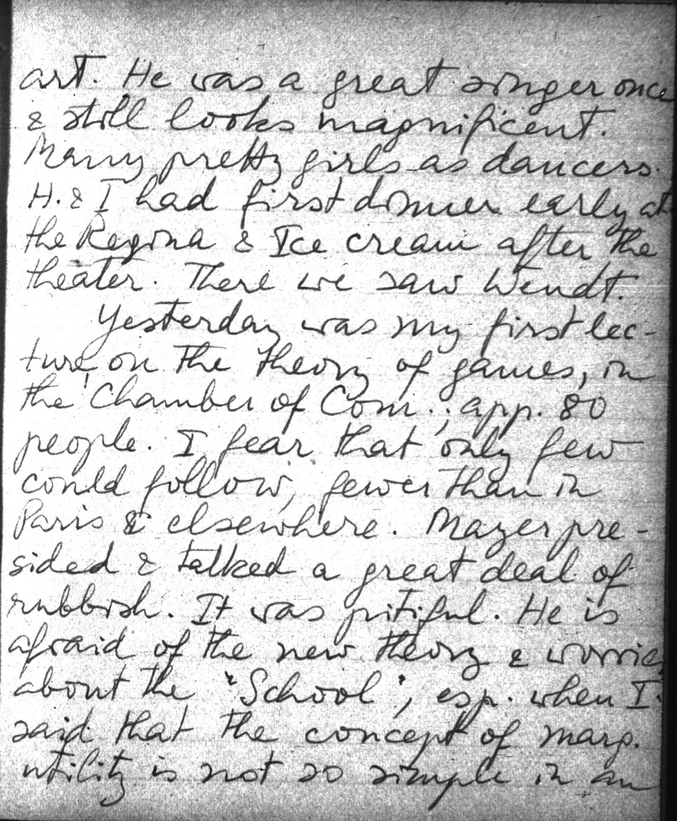Yesterday was my first lecture on the theory of games, in the Chamber of Com.; app. 80 people. I fear that only few could follow, fewer than in Paris & elsewhere. Mayer presided & talked a great deal of rubbish. It was pitiful. He is afraid of the new theory & worries about the School, esp. when I said that the concept of marg. utility is not so simple in an exchange economy. Many old acquaintances: Hryntschak, Bartsch, Weinberger, etc. Schams fell in with the new ideas; a bit to vividly. Yet he may learn them; he wants to write about the book in the ZfN when it appears. I have no idea how the students are I would have liked to speak to them. I shall ask to have something arranged. Degenfeld was there too & made a most surprising statement about the theory; that he liked it, that it seemed realistic etc./ ?.