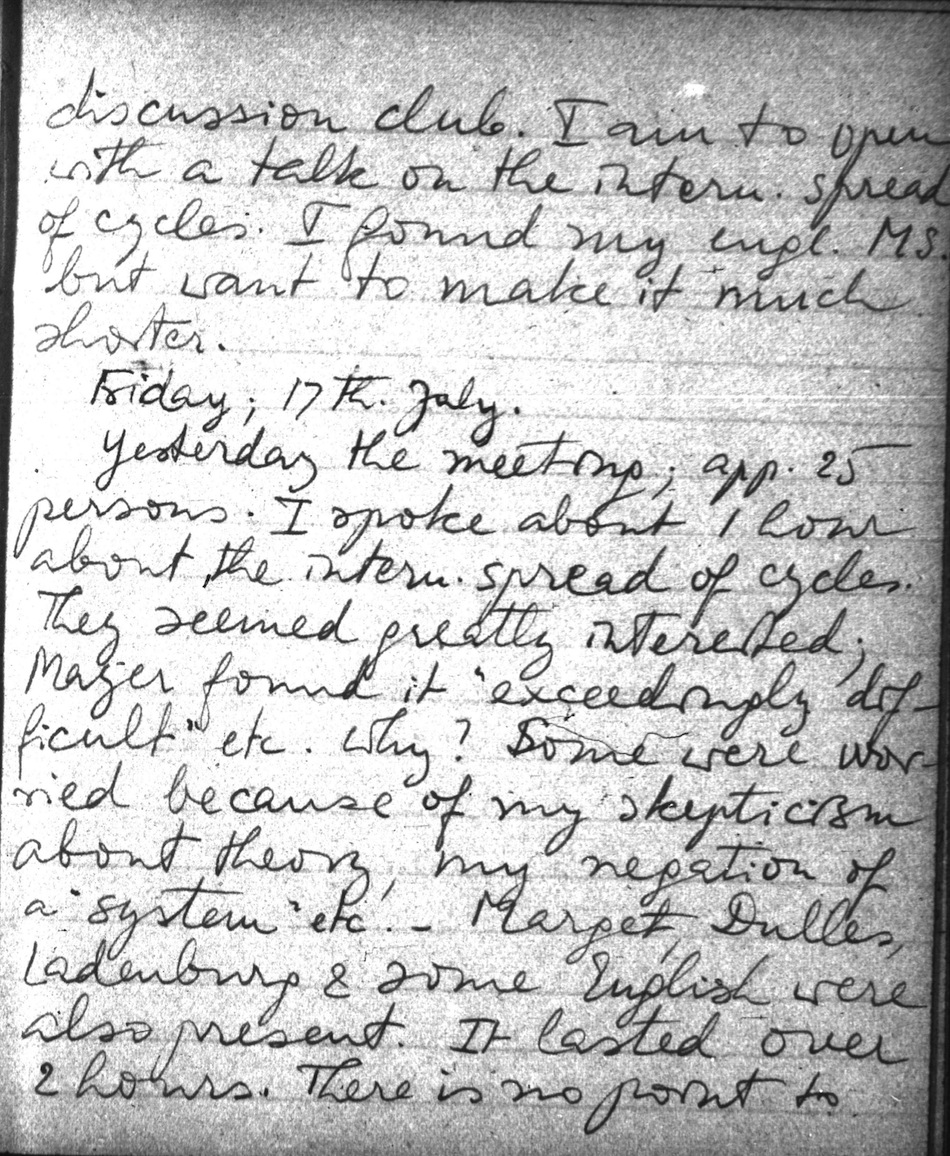 To-day is the first meeting of the Austro- Am.- British discussion club. I am to open with a talk on the intern. spread of cycles. I found my engl. MS but want to make it much shorter.