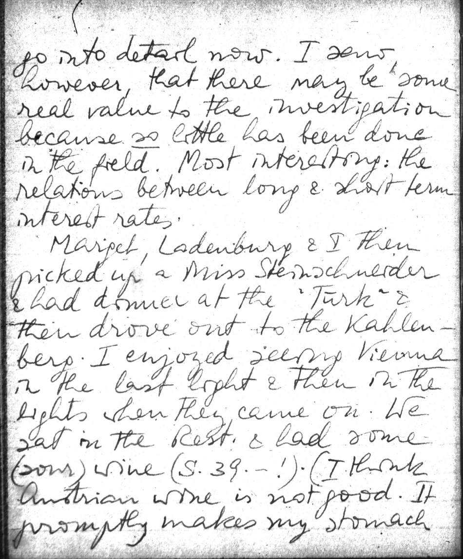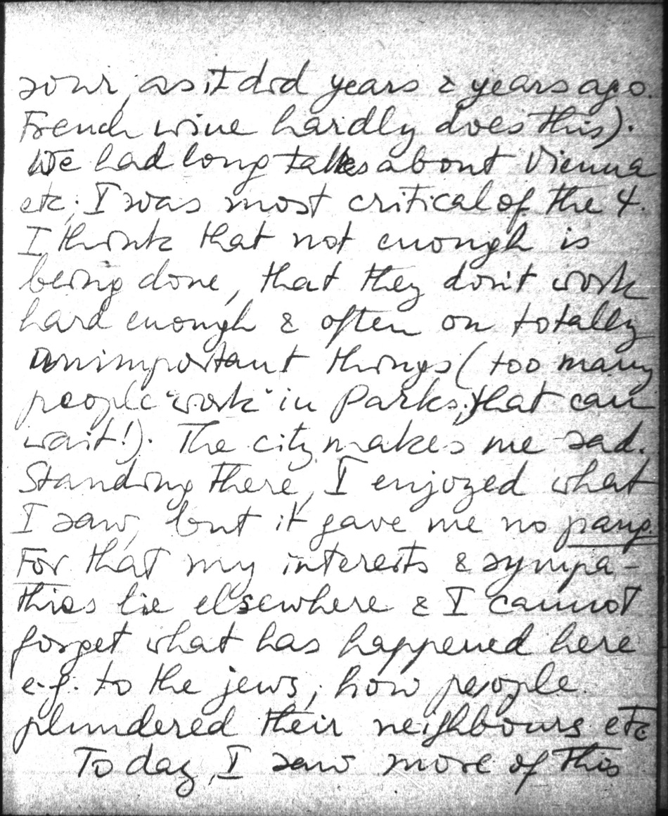 Marget, Ladenburg & I then picked up a Miss Steinschneider & had dinner at the Türk & then drove out to the Kahlenberg. I enjoyed seeing Vienna in the last light & then in the lights when they came on. We sat in the Rest. & had some (sour) wine (S. 39.-!). (I think Austrian wine is not good. It promptly makes my stomach sour as it did years & years ago. French wine hardly does this). We had long talks about Vienna etc; I was most critical of the 4. I think that not enough is being done, that they don´t work hard enough & often on totally unimportant things ( too many people work in Parks; that can wait!). The city makes me sad. Standing there, I enjoyed what I saw, but It gave me no pang. For that my interests & sympathies lie elsewhere & I cannot forget what has happened here e.g. to the jews; how people plundered their neighbours etc.