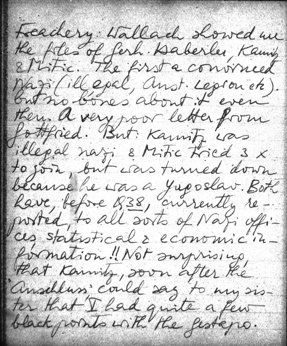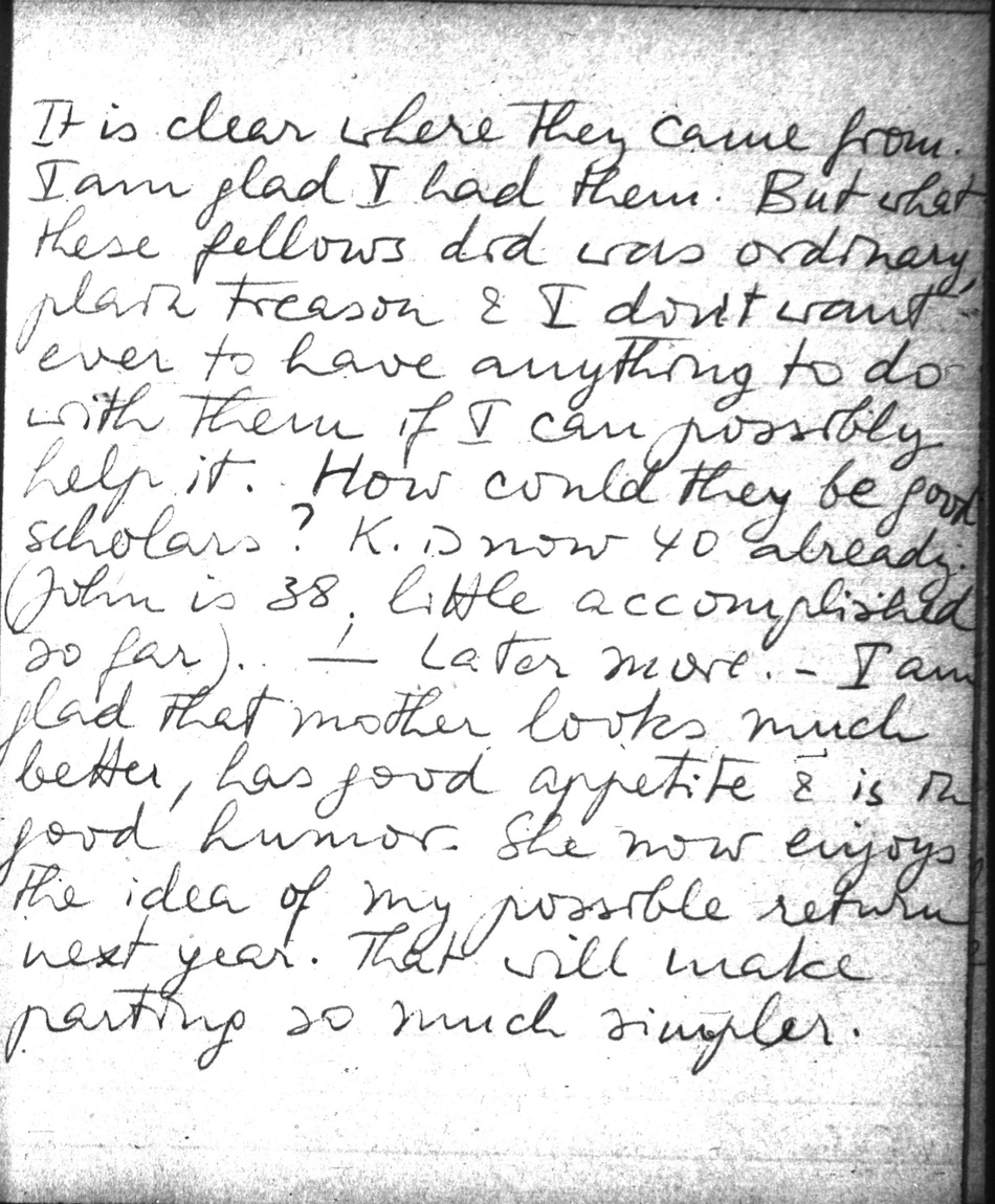 Today, I saw more of this treachery: Wallach showed me the files of Gerh. Haberler, Kamitz & Mitic. The first a convinced Nazi (illegal, Aust. Legion etz). but no bones about it even then. A very poor letter from Gottfried. But: Kamitz was illegal nazi & Mitic tried 3 x to join, but was turned down because he was a Yugoslav. Both have, before 1938, currently reposted, to all sorts of Nazi offices statistical & economic information!! Not surprising, that Kamitz, soon after the Anschluss could say to my sister that I had quite a few black points with the Gestapo. It is clear where they came from. I am glad I had them. But what these fellows did was ordinary, plain treason & I don´t want ever to have anything to do with them if I can possibly help it. How could they be good scholars? K. is now 40 already. (John is 38; little accomplished so far). Later more. I am glad that mother looks much better, has good appetite & is in good humor. She now enjoys the idea of my possible return next year. That will make parting so much simpler.