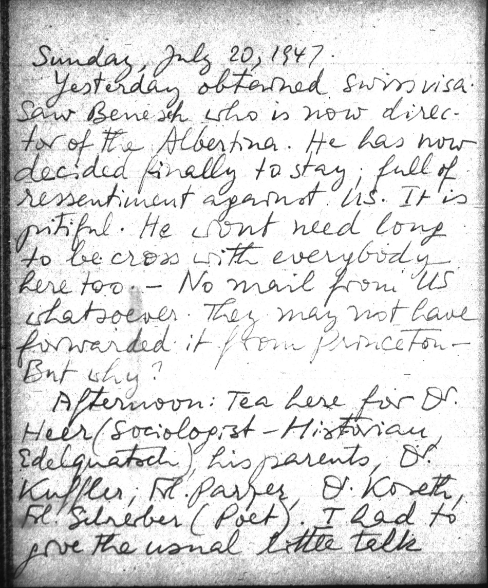 Yesterday obtained Swiss visa. Saw Benesch who is now director of the Albertina. He has now decided finally to stay; full of ressentiment against US. It is pitiful. He wont need long to be cross with everybody here too. No mail from US whatsoever. They may not have forwarded it from Princeton- But why?