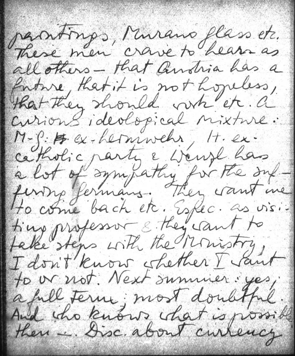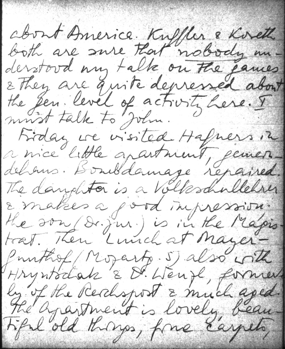 Friday we visited Hafners in a nice little apartment, gemeindehaus. Bombdamage repaired. The daughter is a Volksschullehrer & makes a good impression; the son (Dr. jur.) is in the Magistrat. Then Lunch at Mayer-Gunthof (Mozartg. 5) also with Hryntschatz & Dr. Wenzl, formerly of the Reichspost & much aged. The apartment is lovely, beautiful old things, fine carpets, paintings, Murano glass etc. These men crave to hear as all others- that Austria has a future, that it is not hopeless, that they should work etc. A curious ideological mixture: M-G: ex-heimwehr, H. ex-catholic party & Wenzl has a lot of sympathy for the suffering Germans. They want me to come back etc. Espec. as visiting professor &they want to take steps with the Ministry. I don´t know whether I want to or not. Next summer: yes; a full term: most doubtful. And who knows what is possible then-. Disc. about currency reform. I am rather inclined to oppose Rizzi. Kranland is said to be almost mad & suffers from megalomania. I should see him but have little intention.