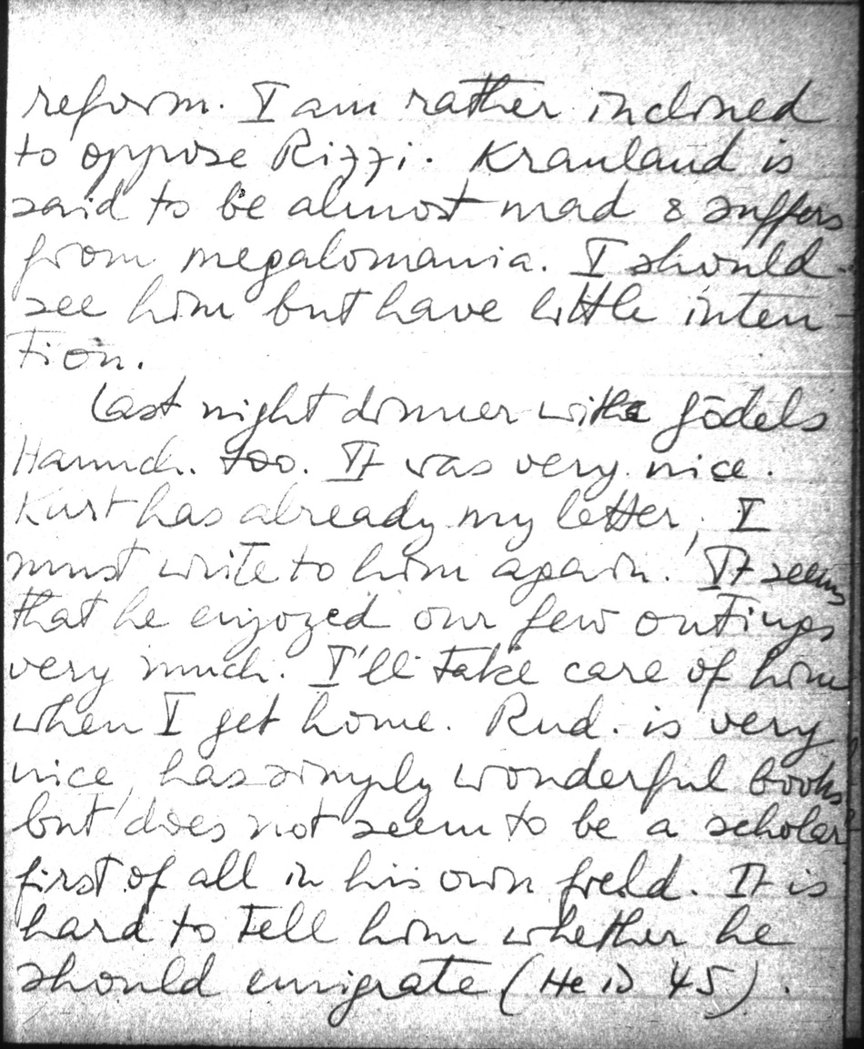 Last night dinner with Gödels Hannch. too. It was very nice. Kurt has already my letter; I must write to him again. It seems that he enjoyed our few outings very much. I´ll take care of him when I get home. Rud. is very nice, has simply wonderful books but does not seem to be a scholar; first of all in his own field. It is hard to tell him whether he should emigrate. (He is 45).