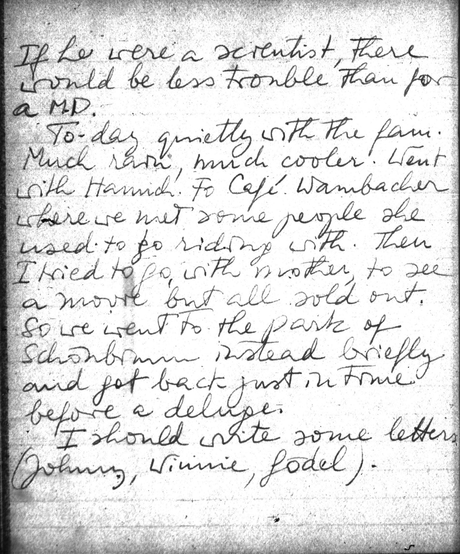 To-day quietly with the fam. Much rain, much cooler. Went with Hannch. To Café Wambacher where we met some people she used to go riding with. Then I tried to go, with mother, to see a movie but all sold out. So we went to the park of Schönbrunn instead briefly and got back just in time before a deluge.