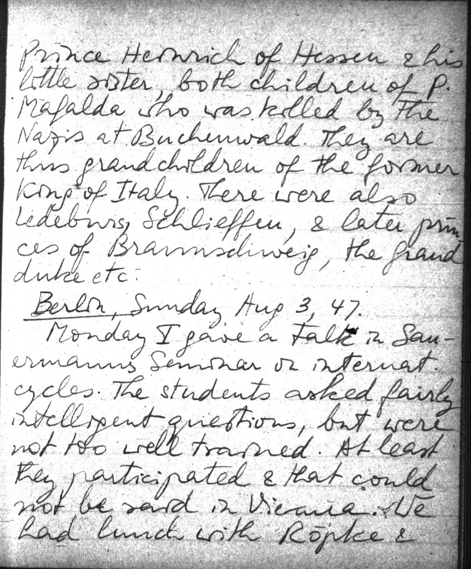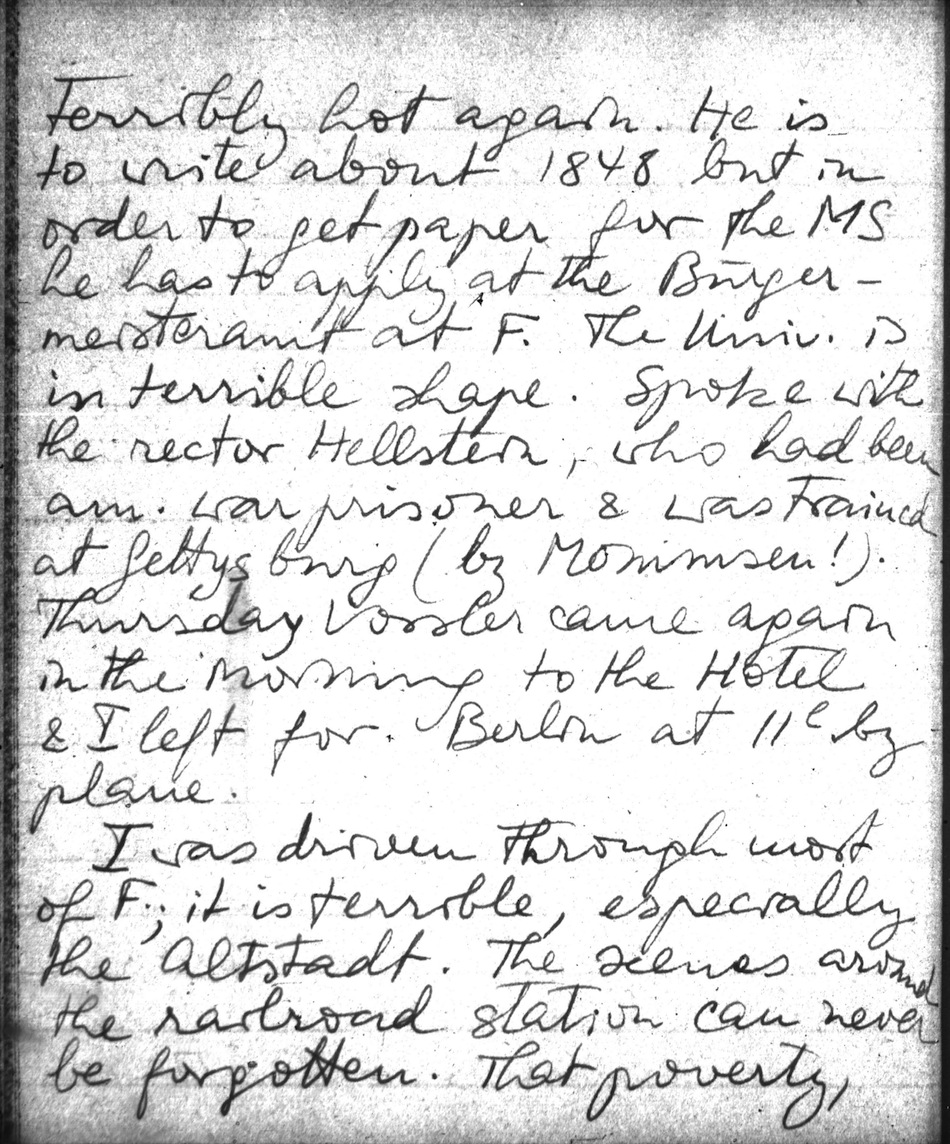 Wednesday I went again out to Vossler & we had further long talks. The same princes were at dinner, also those of Braunschweig, his wife & Griechenland Prince Heinrich is a really gifted partner. I took several photos, gave Vossler a shirt, cheese, coffee, etc etc. It was terribly hot again. He is to write about 1848 but in order to get paper for the MS he has to apply at the Bürgermeisteramt at F. The Univ. is in terrible shape. Spoke with the rector Hellstein, who had been am. war prisoner & was trained at Gettysburg (by Mommsen!). Thursday Vossler came again in the morning to the Hotel & I left for Berlin at IIe by plane.