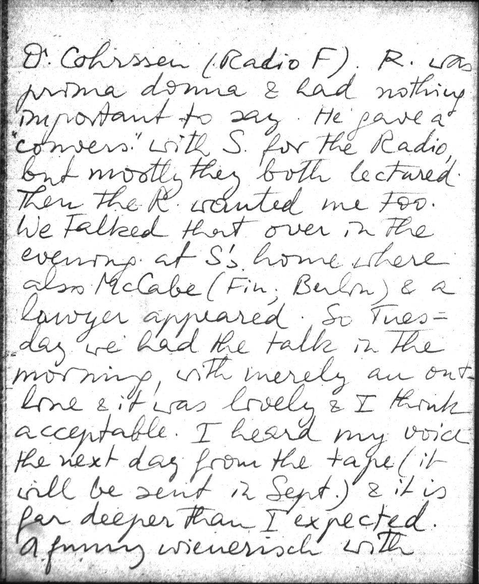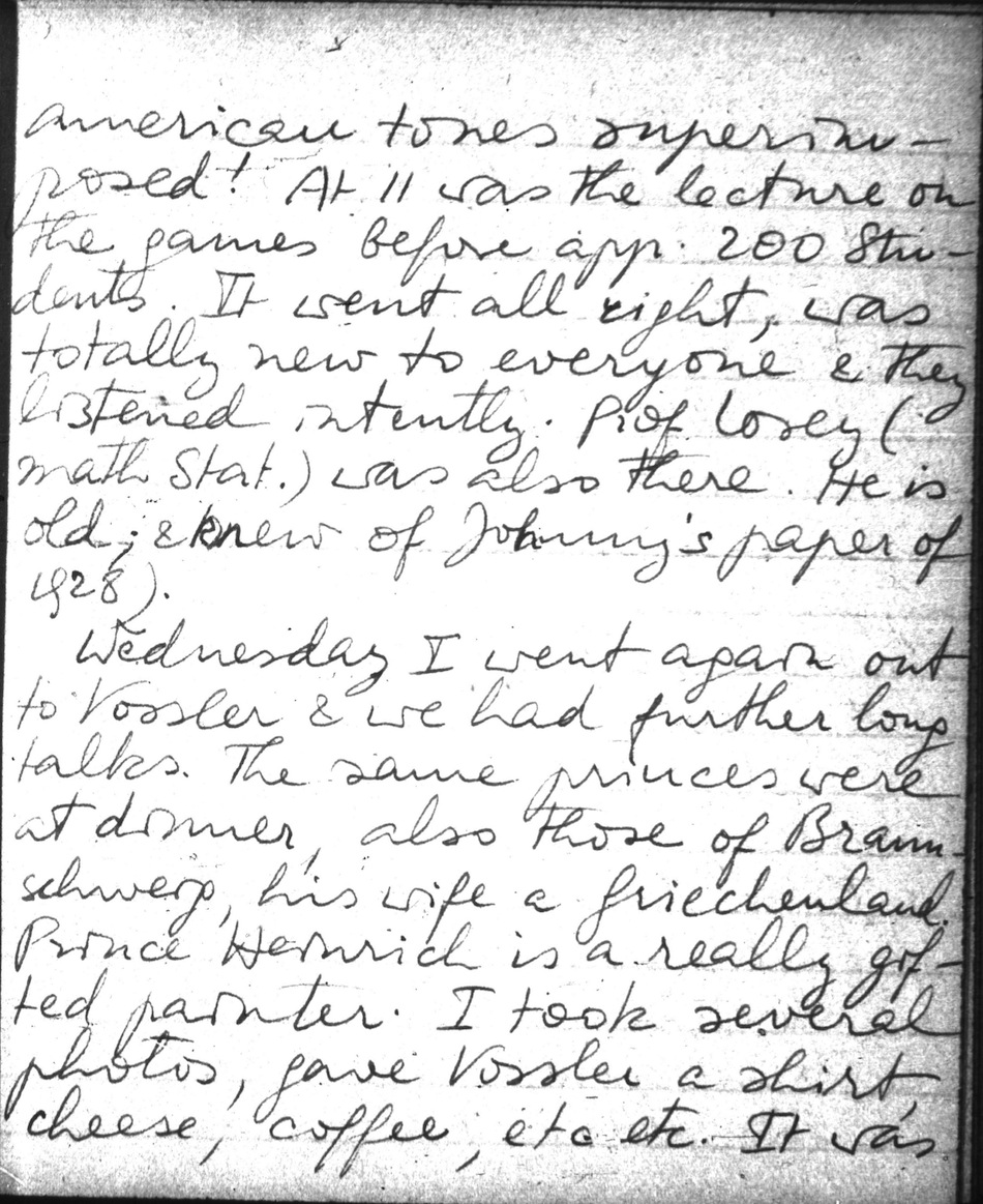 Monday I gave a talk in Sauermanns Seminar on internat. cycles. The students asked fairly intelligent questions, but were not too well trained. At least they participated & that could not be said in Vienna. We had lunch with Röpke & Dr. Cohissen (Radio F). R. was prima donna & had nothing important to say. He gave a convers. with S. for the Radio, but mostly they both lectured. Then the R. wanted me too. We talked that over in the evening at Ss home where also McCabe (Fin; Berlin) & a lawyer appeared. So Tuesday we had the talk in the morning, with merlely an outine & it was lovely & I think acceptable. I heard my voice the next day from the tape (it will be sent in Sept.) & it is far deeper than I expected. A funny wienerisch with American tones superimposed! At 11 was the lecture on the games before app. 200 Students. It went all right, was totally new to everyone & they listened intently. Prof Losey (math Stat.) was also there. He is old; & knew of Johnnys paper of 1928).
