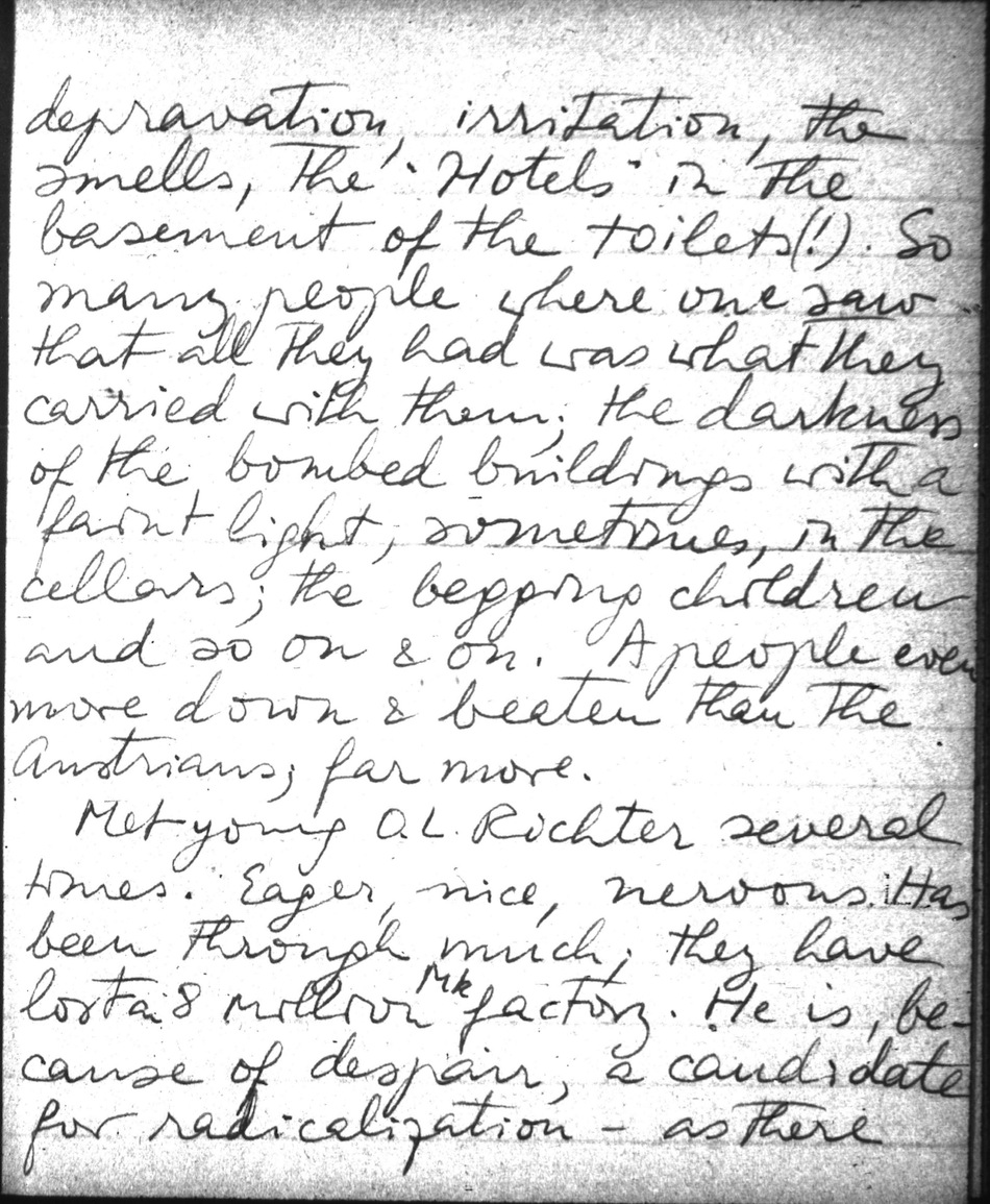 I was driven through most of F.; it is terrible, especially the Altstadt. The scenes around the railroad station can never be forgotten. That poverty, depravation, irritation, the smells, the Hotels in the basement of the toilets (!). So many people where one saw that all they had was what they carried with them; the darkness of the bombed buildings with a faint light, sometimes, in the cellars; the begging children and so on & on. A people even more down & beaten than the Austrians; far more.