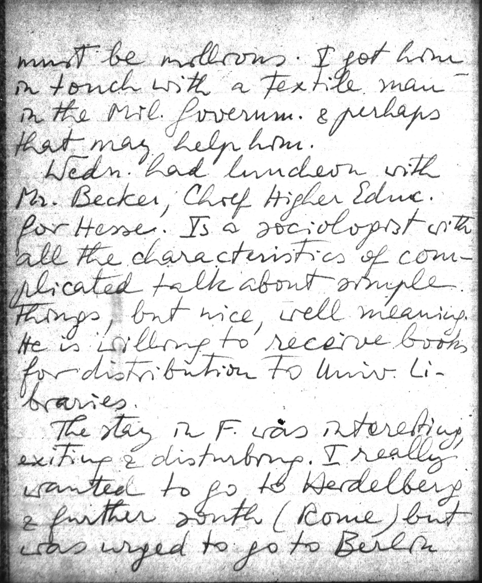 Wedn. Had luncheon with Mr. Becker, Chief Higher Educ. for Hesse. Is a sociologist with all the characteristics of complicated talk about simple things, but nice, well meaning. He is willing to receive books for distribution to Univ. Libraries.