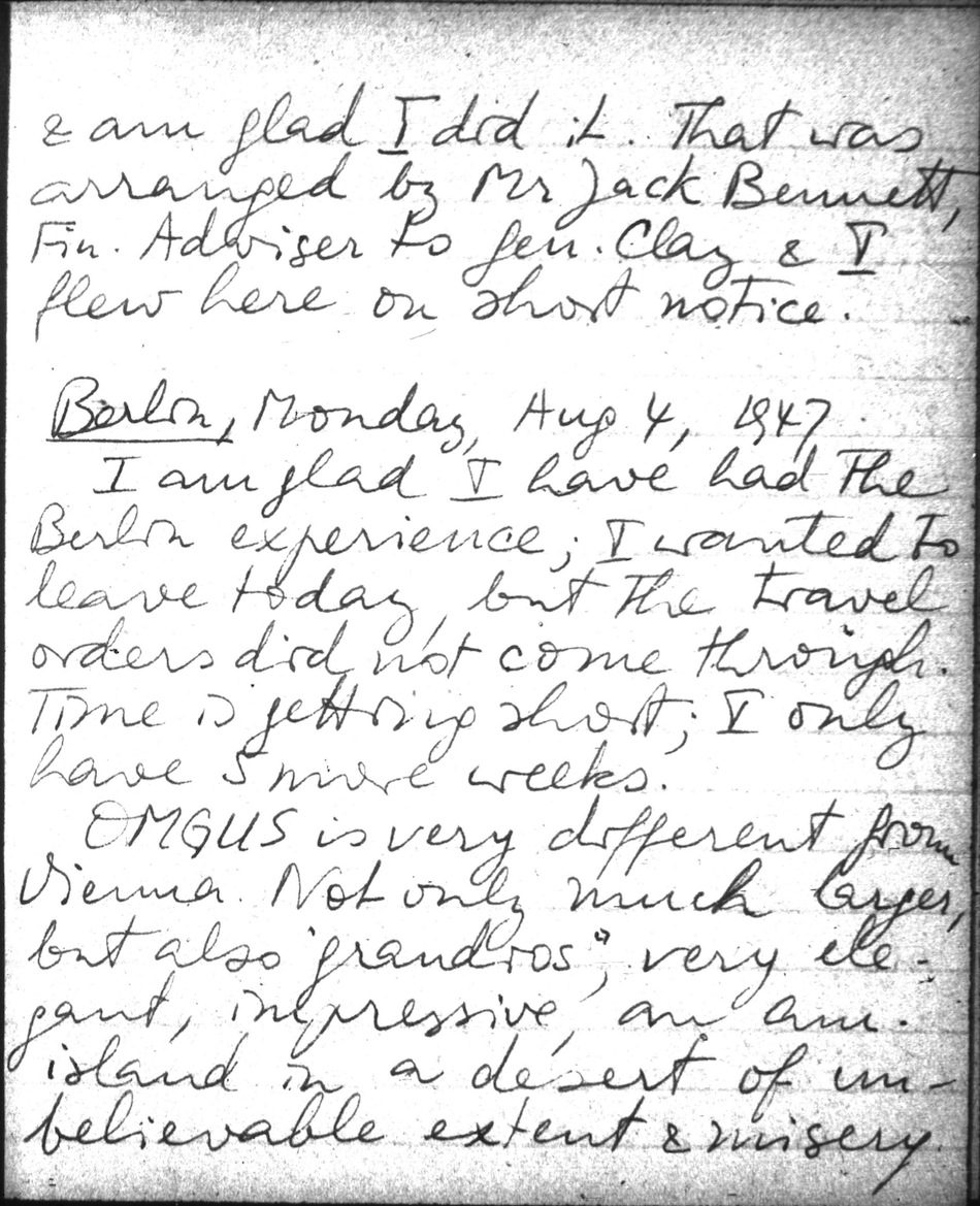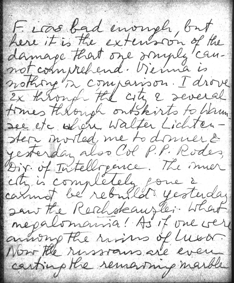 F. was bad enough, but here it is the extension of the damage that one simply cannot comprehend. Vienna is nothing in comparison. I drove 2x through the city & several times through outskirts to Wannsee etc where Walter Lichtenstein invited me to dinner & yesterday also Col P.P. Rodes, Dir. of Intelligence. The inner city is completely gone & cannot be rebuild. Yesterday saw the Reichskanzlei. What megalomania! As if one were among the ruins of Luxor. Now the russians are even carting the remaining marble away to make another atrocious monument. The Tiergarten is potatofields with odd ruins of the Siegesallee interspersed. Around the Schloss it is particularly ghastly. Inside the university just ruins but the Russians are trying to get it going again. What an odd collection of professors!