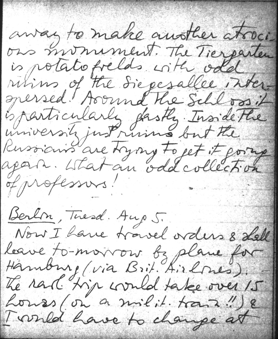 Now I have travel orders & shall leave to-morrow by plane for Hamburg (via Brit. Airlines). The rail trip would take over 15 hours (on a milit. train!!) & I would have to change at Hannover at 4 in the morning. I may be able to go on to-morrow to Kiel, but probably only on Thursday. I should like to arrive in Copenhagen on Friday evening who knows how long that will take again. Then I could spend the week-end with the Wessels.