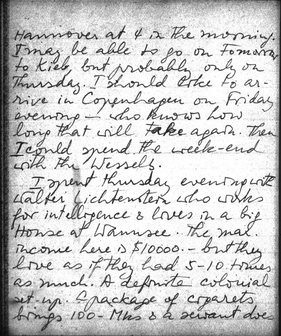 I spent thursday evening with Walter Lichtenstein who works for intelligence & lives in a big House at Wannsee. The max. income here is $ 10000.- but they live as if they had 5-10 times as much. A definite colonial set-up. A package of cigarets brings 100- Mks & a servant does not get more than 200.- a month. Max. rent for a house is $ 150.- He gave me a good view of the overal set up, drove me around, espec. tow. Charlottenburg & the evening was quite profitable. Dinner excellent & the wine also.